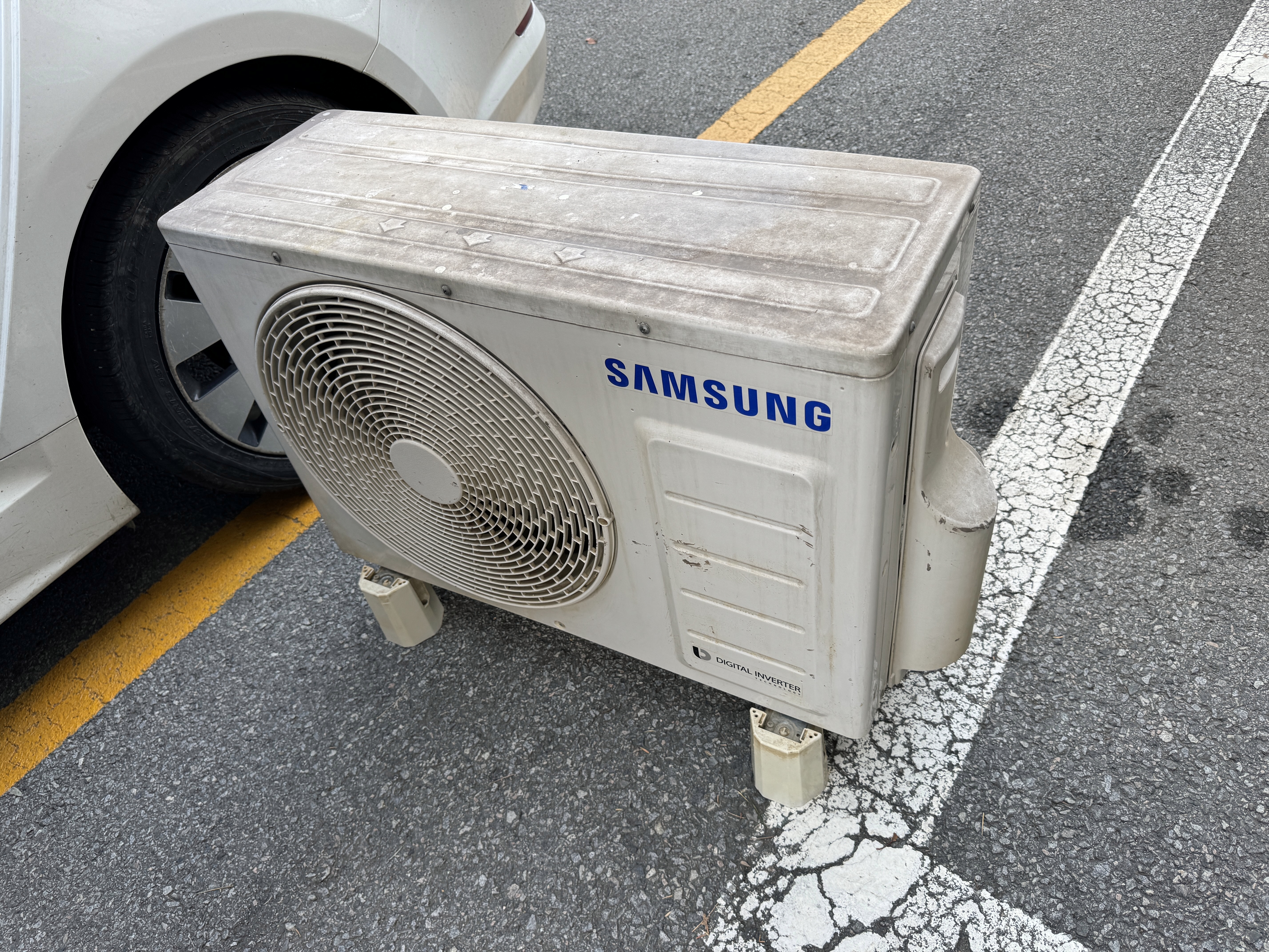 아파트 1층의 가정어린이집이고, 아파트 화단에 실외기를 세워놓았다고 합니다. 그래서 외부 오염도 조금 있고 비가 오며 화단의 흙이 튀며 뒤 라디에이터에 흙이 조금 묻어있기도 했습니다만, 일단 실내기는 트렁크에 넣고 이 실외기를 차량 뒷좌석에 싣고 가기로 합니다.