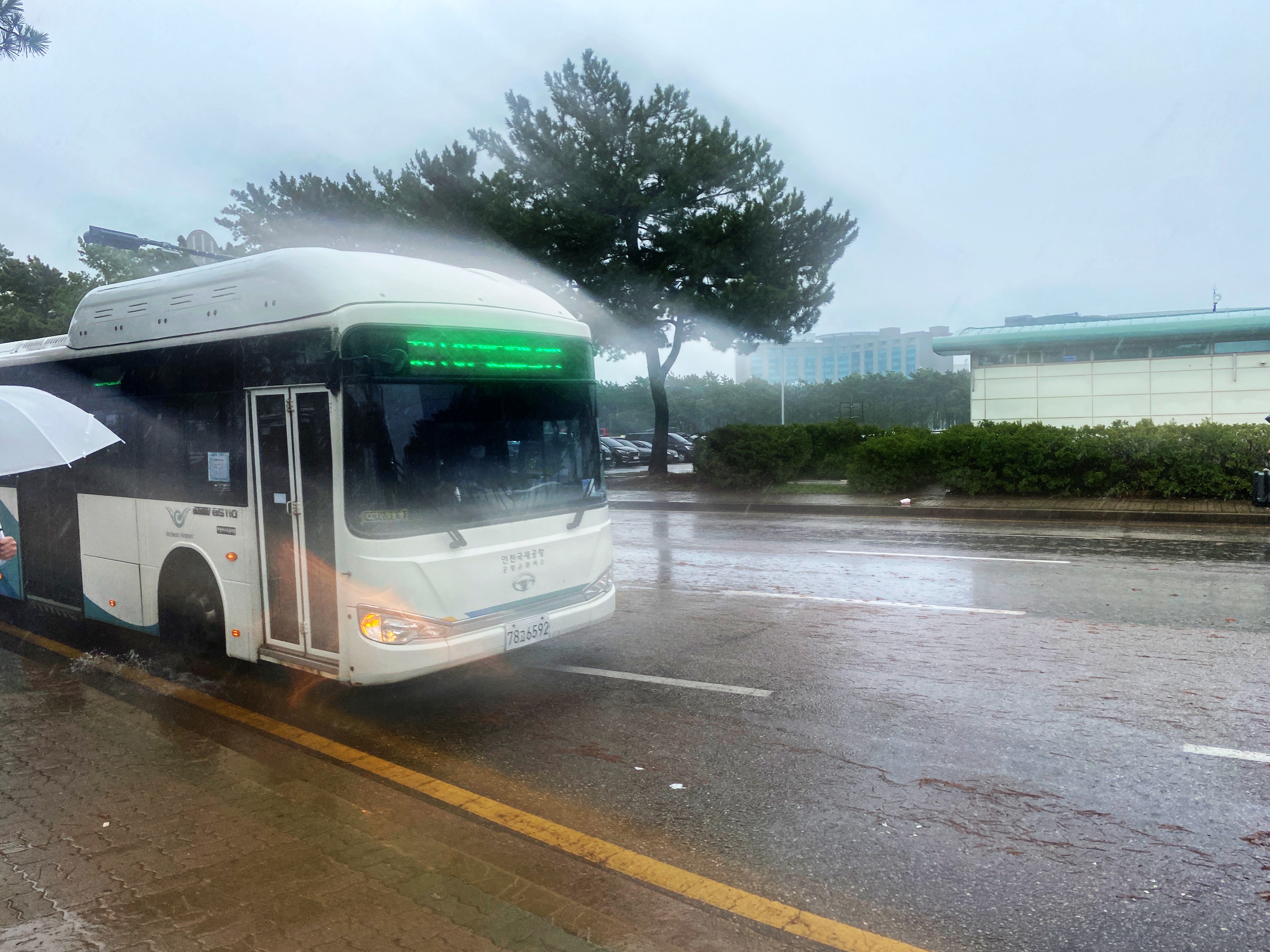 태풍은 지나갔다지만 비는 미친 듯이 내리고 셔틀버스 승차장으로 향합니다. 주차대행 인도장이 그립습니다. 비 한 방울 맞지 않고 바로 걸어가서 엘리베이터에 올라타면 출국장이 나오는데 말이죠.. 길 건너편에 셔틀버스 승차장이 있습니다. 우산을 썼지만 비바람을 막기엔 역부족이었습니다.