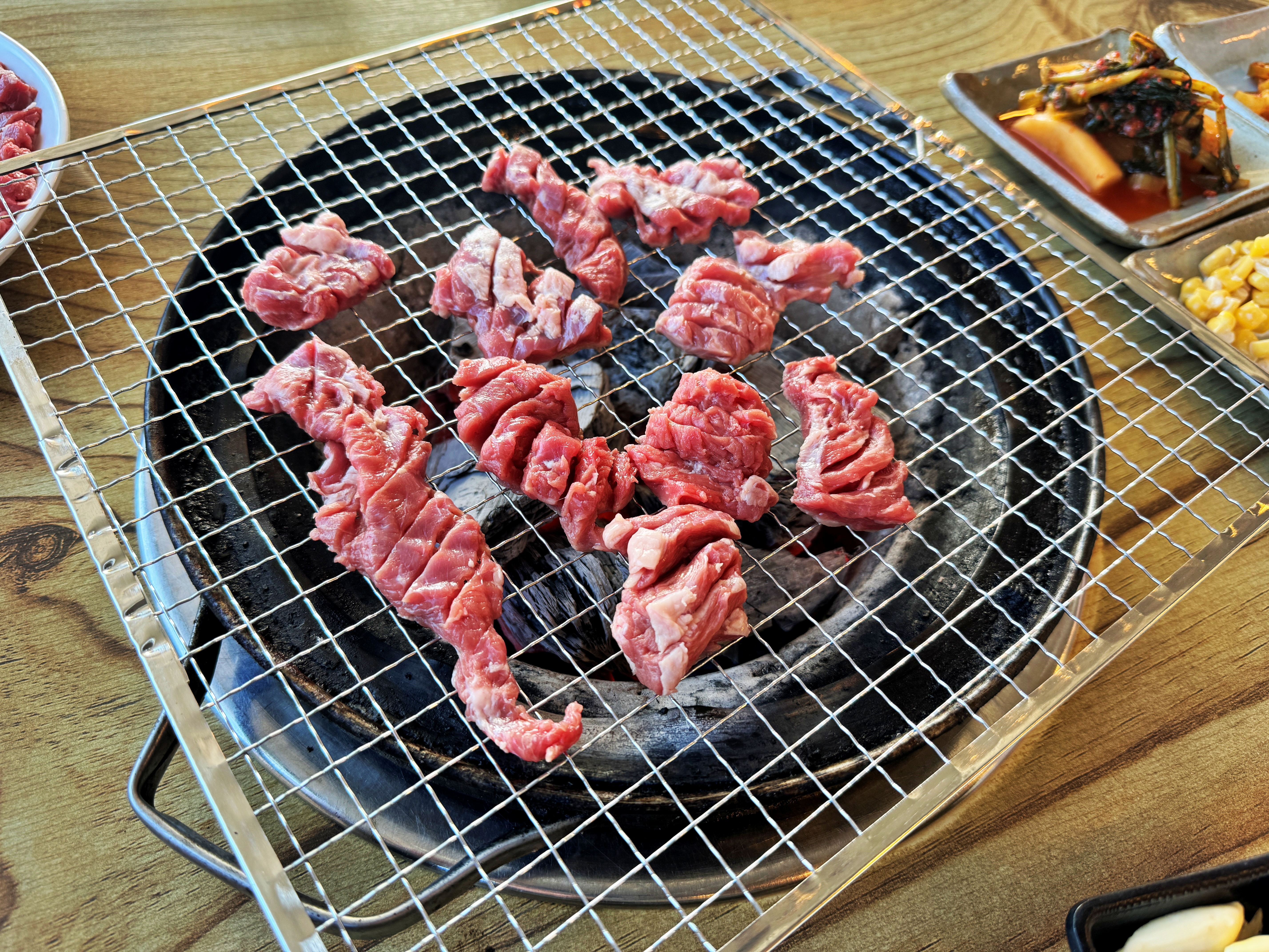 생각보다 빨리 익고 자주 뒤집어주게 되네요. 갈매기살은 갈비살과 삼겹살 사이에 끼어있는 부위인데 삼겹살보다는 갈비살에 가까운 비쥬얼과 갈비보다는 좀 더 쫀득한 식감을 자랑합니다.