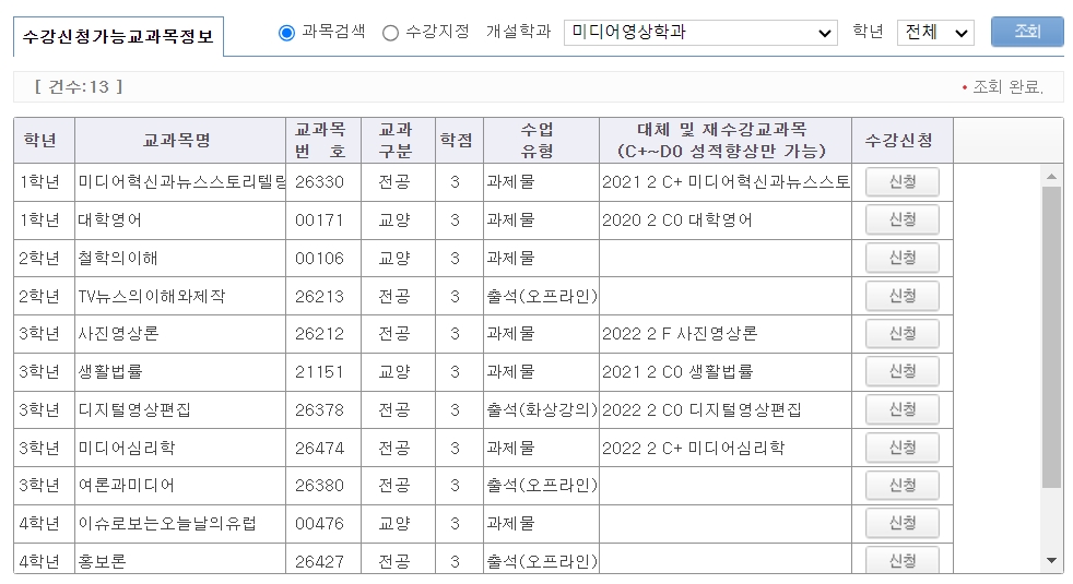 그렇게 타과 교과목이나 교양까지 쭉 살펴보곤 전공 하나 넣고 말았습니다.