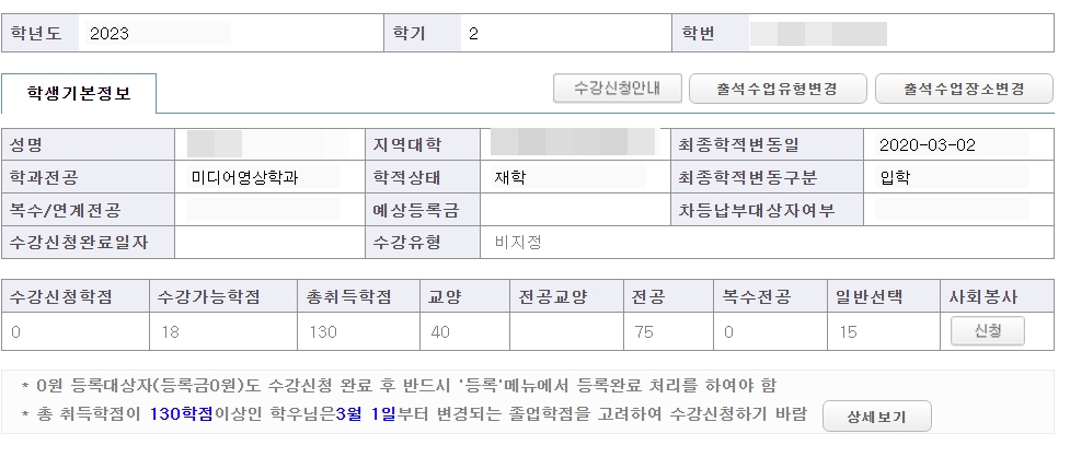 총 취득학점이 130학점 이상인 학우님들을 위한 공지사항을 봤으나 근래들어 개판친 과목들이 많아 평점이 3.4밖에 나오지 않아 조기졸업은 불가합니다. 그래서 뭐가 되었건 한 학기를 더 다녀야 합니다. 한 과목만 수강해도 됩니다. 일단 구미에 당기는 과목이 뭐가 있을지 구경이나 하고 결정하기로 합니다. 이번에도 임원장학금의 수혜를 보게 되는지라 학생회비와 발전기금정도만 납부하면 됩니다.
