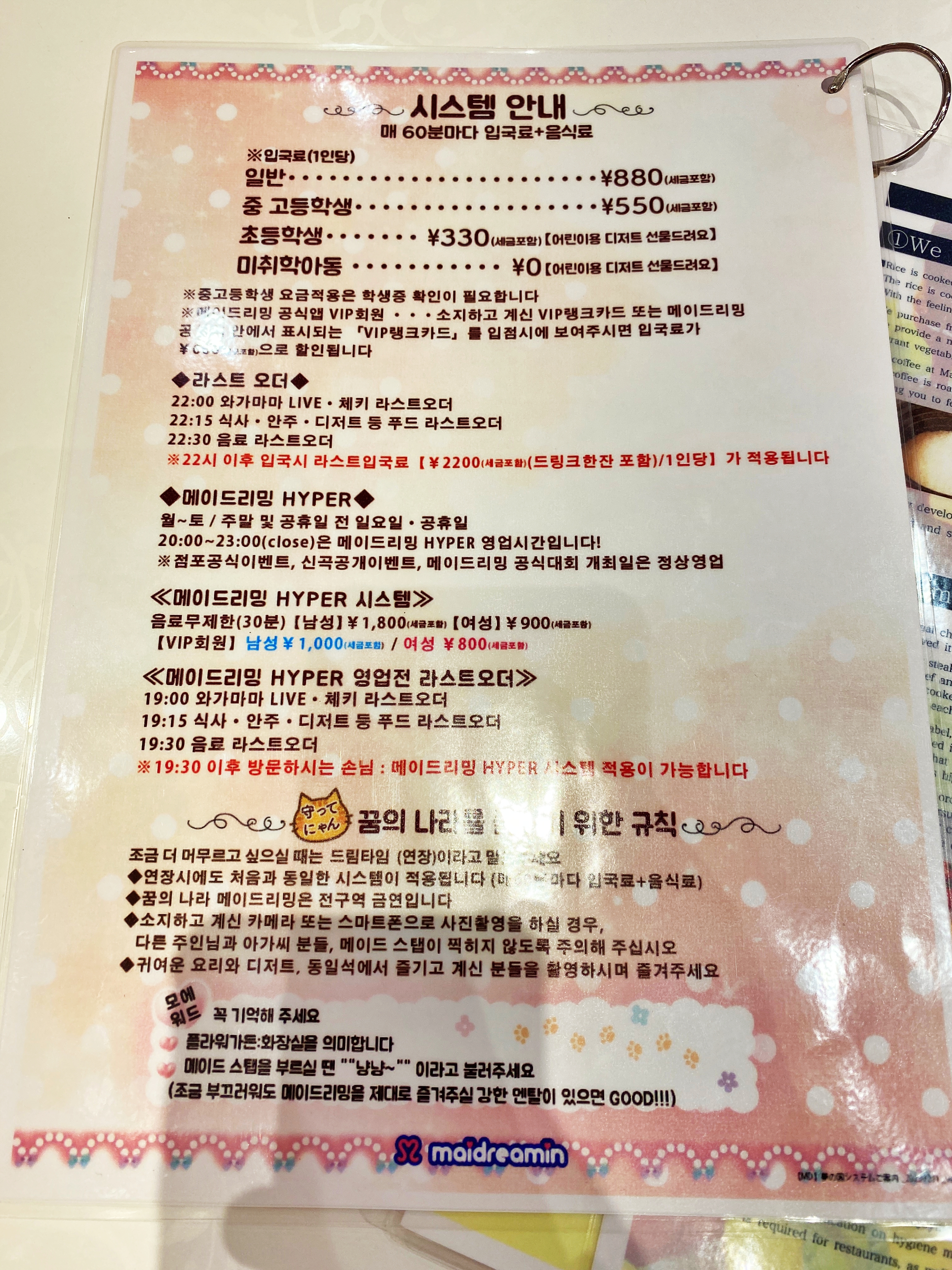 8시부터는 펍(PUB) 느낌의 '메이드리밍 HYPER'로 운영된다고 합니다. 메뉴판을 보니 8시 이후로는 주류를 판매하더군요. 그냥 카와이한 메이드카페를 체험해보고 싶으시다면 오후 8시 이전 방문을 호프집 분위기 속에서 있고 싶으시다면 8시 이후 방문을 추천드립니다.