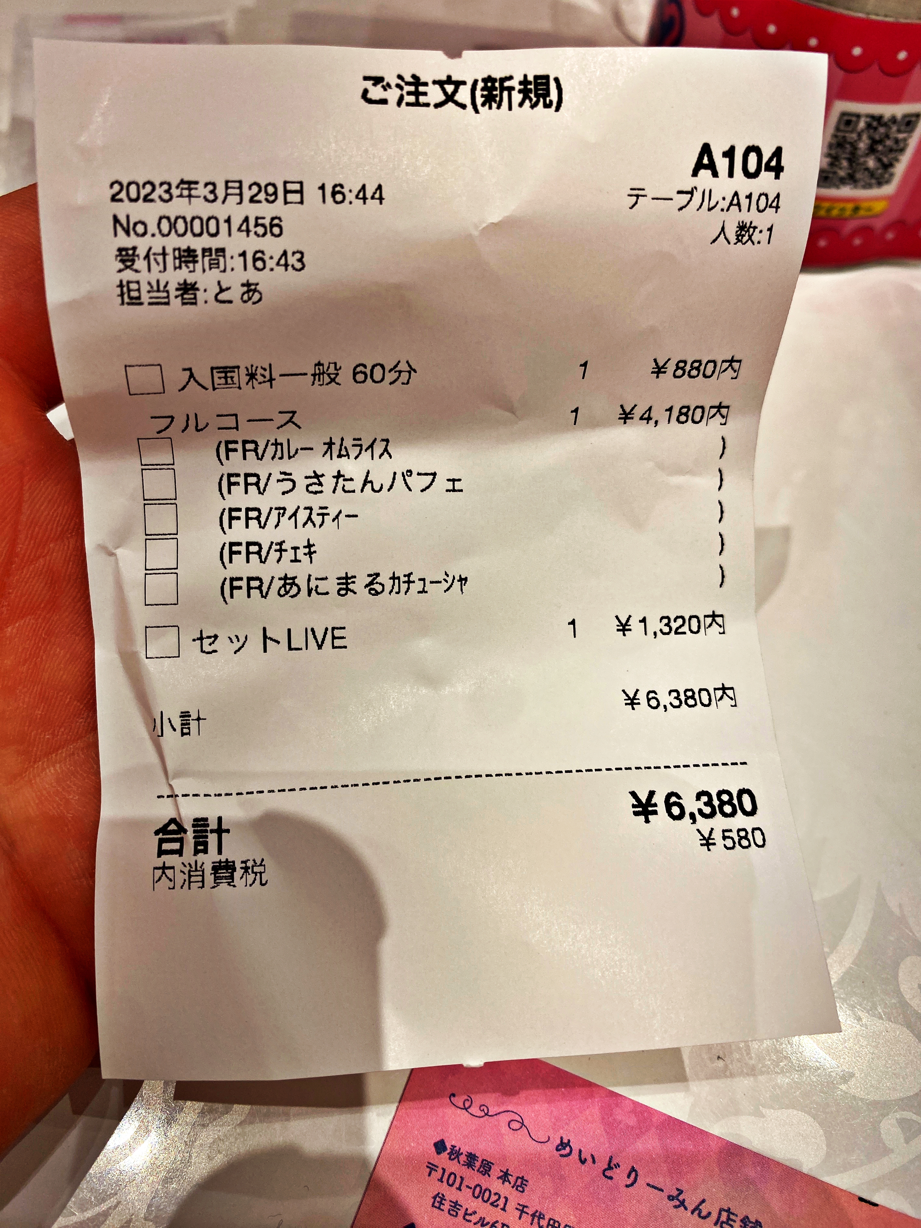 입장료에 풀 코스 라이브까지 더해 6,380엔이 청구됩니다.