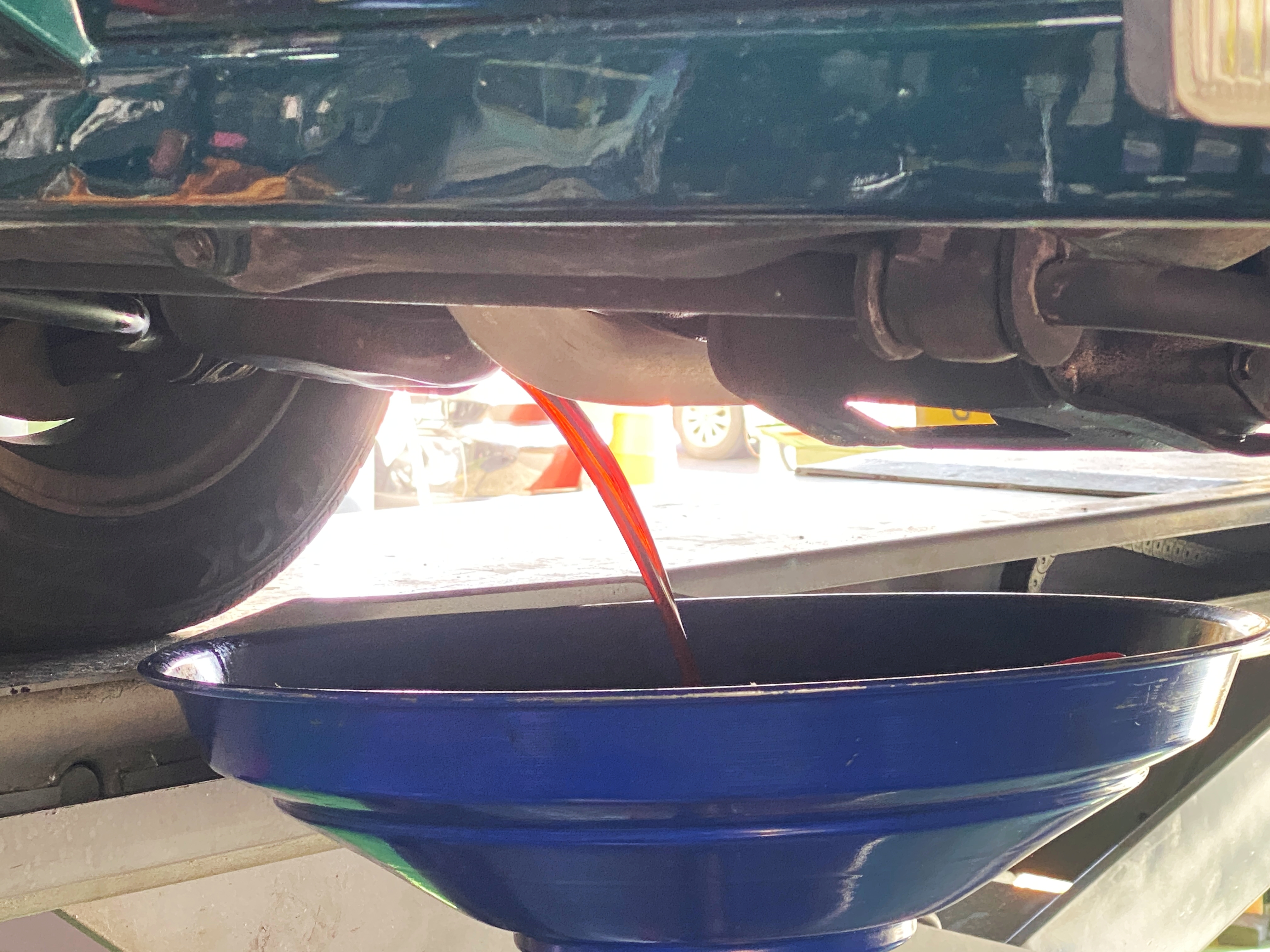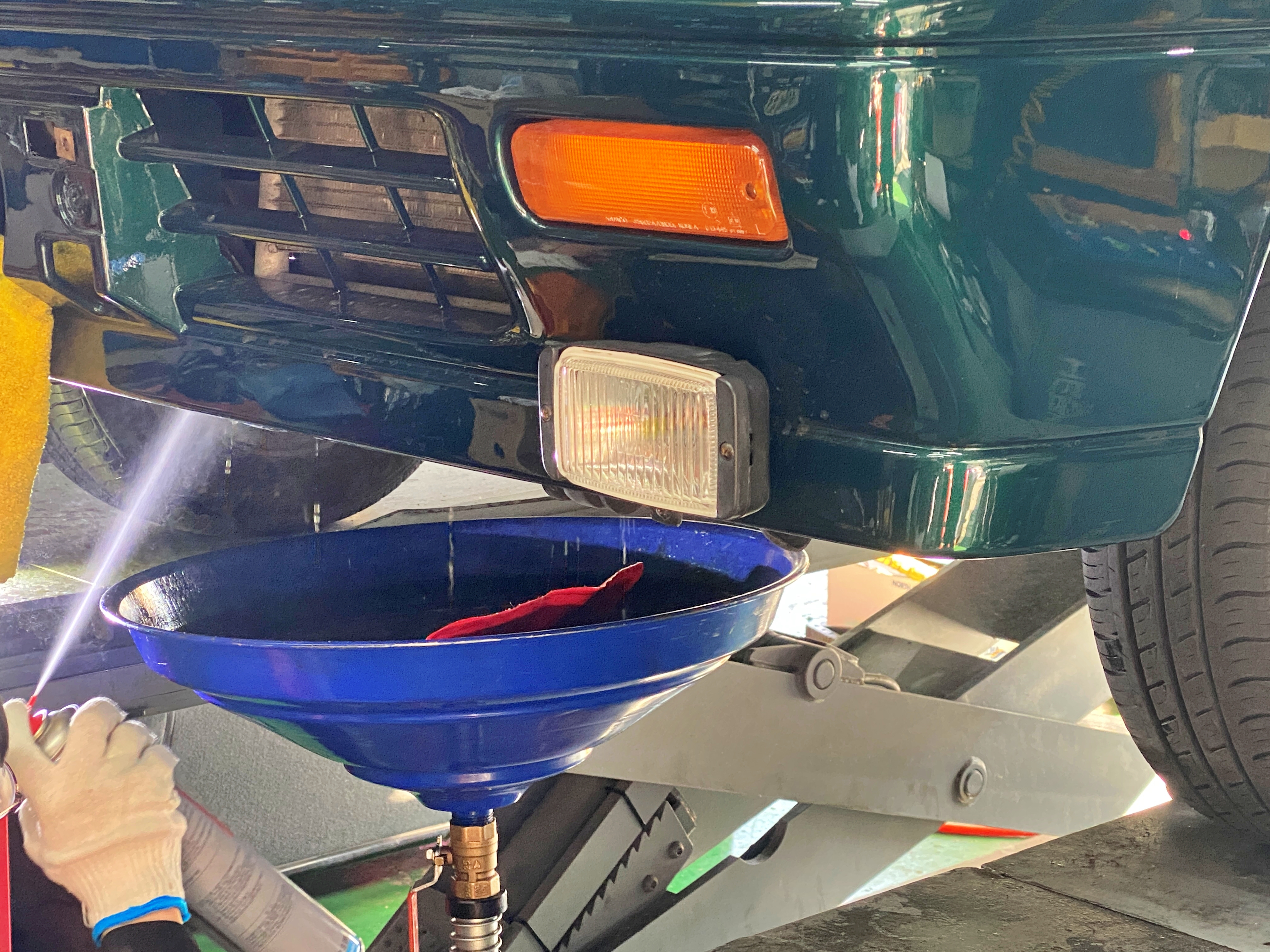 아까 드레인으로 내려오던 기존 오일 색과 크게 다르진 않아 보입니다만, 여튼 여러 첨가제의 영향으로 상당히 진한 색상을 자랑합니다. 오일필터 방향으로 밀어 넣어주고 리프트를 내려 엔진 위쪽 메인 주입구로도 마저 오일을 넣어가며 주입량을 맞춥니다.