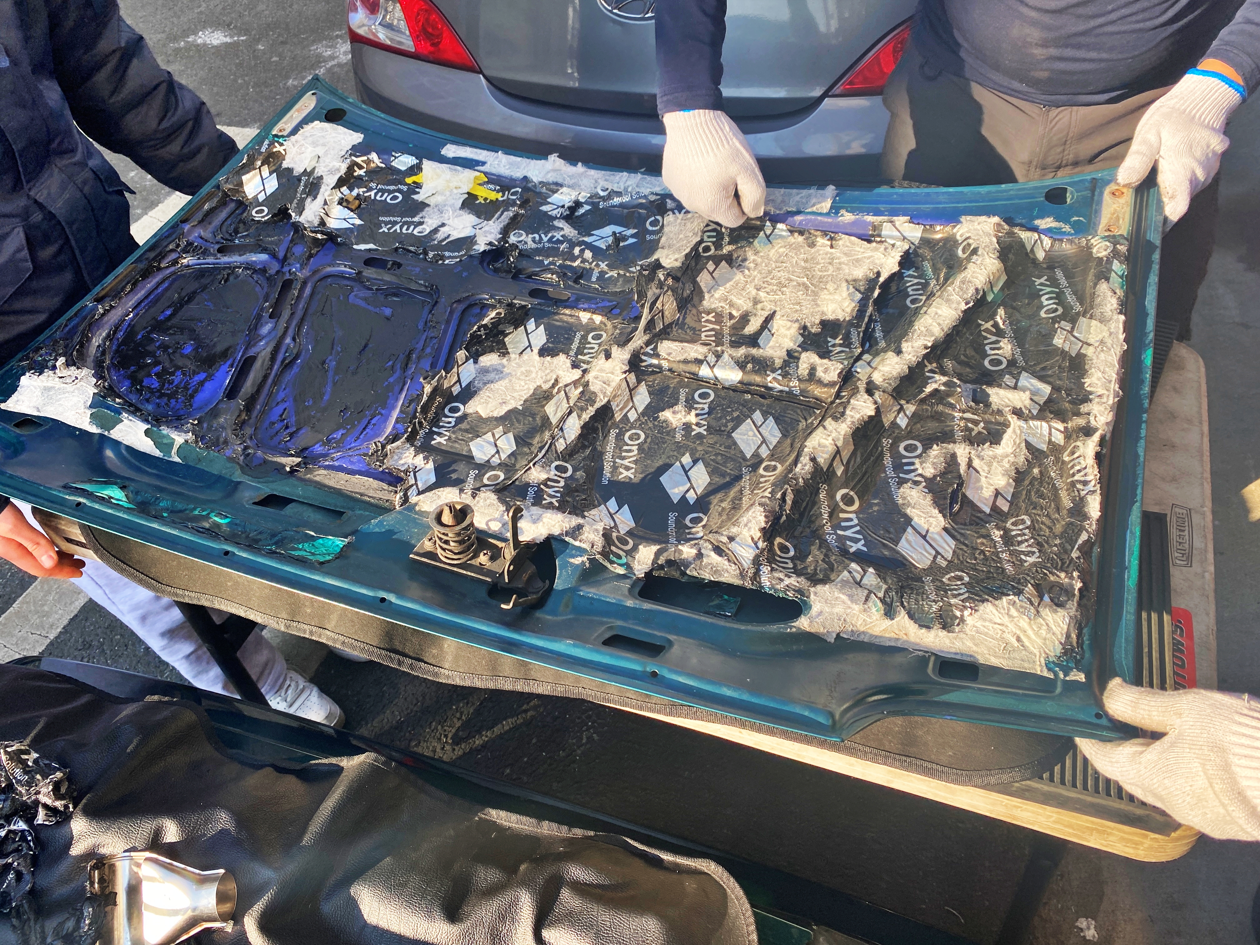 본넷의 전 주인도 포기했고, 도색 당시 공업사에서도 모두 벗겨내는 일은 포기했습니다. 그러나 결국 여기서 도전을 하게 되는군요. 문짝 같은 곳에 방음 방진을 위해 붙여두는 건 괜찮습니다만, 열이 많이 받는 본넷에 이렇게 덕지덕지 붙이는 일은 정말 비추합니다. 복구하기도 어렵고요.