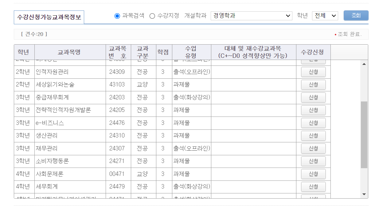 그래서 이 방법으로 인원초과가 걸려버린 과목까지 수강신청 항목에 넣었습니다.