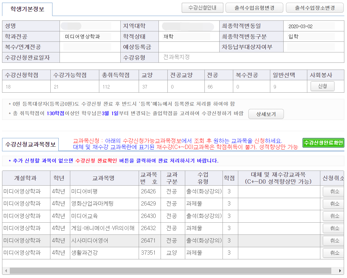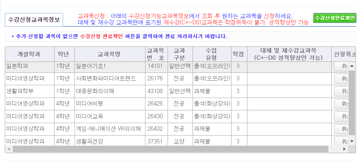 수강신청 페이지에 접속하니 기본정보와 함께 수강이 지정된 과목들이 기본으로 들어있습니다.