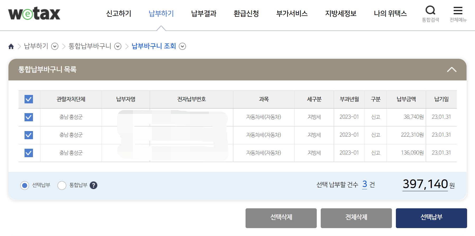 위택스 홈페이지에 접속하여 전자납부를 진행합니다. 2000cc 중형차 신차 수준의 세금입니다.