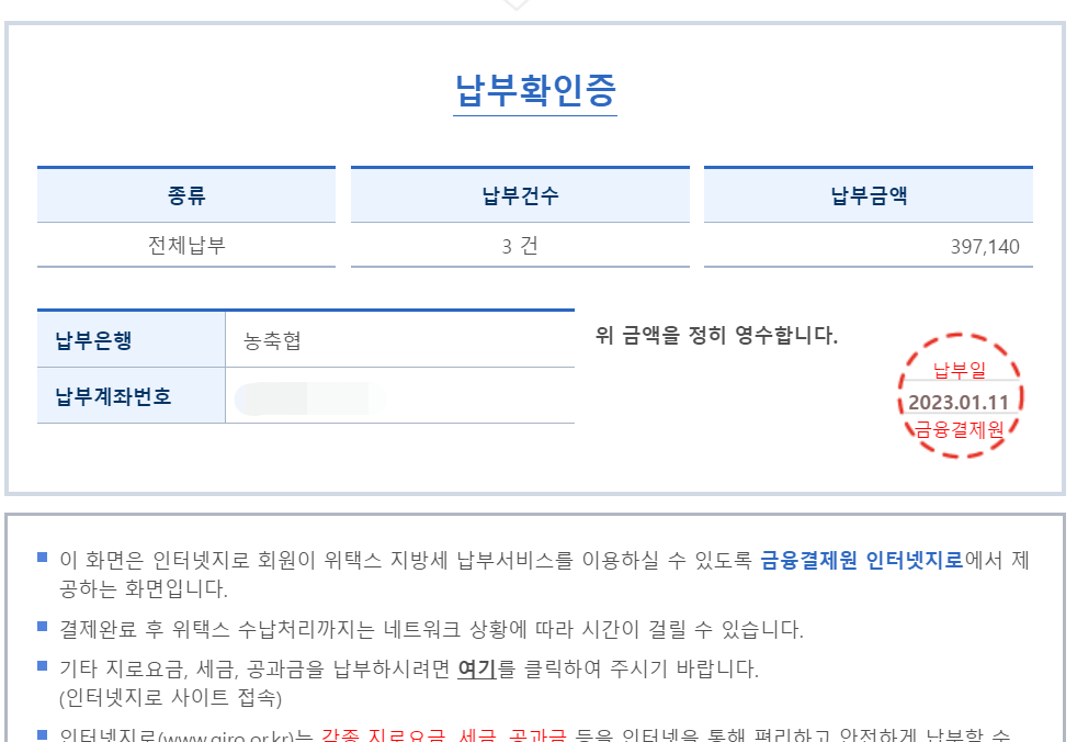 바로 계좌이체로 납부했습니다.