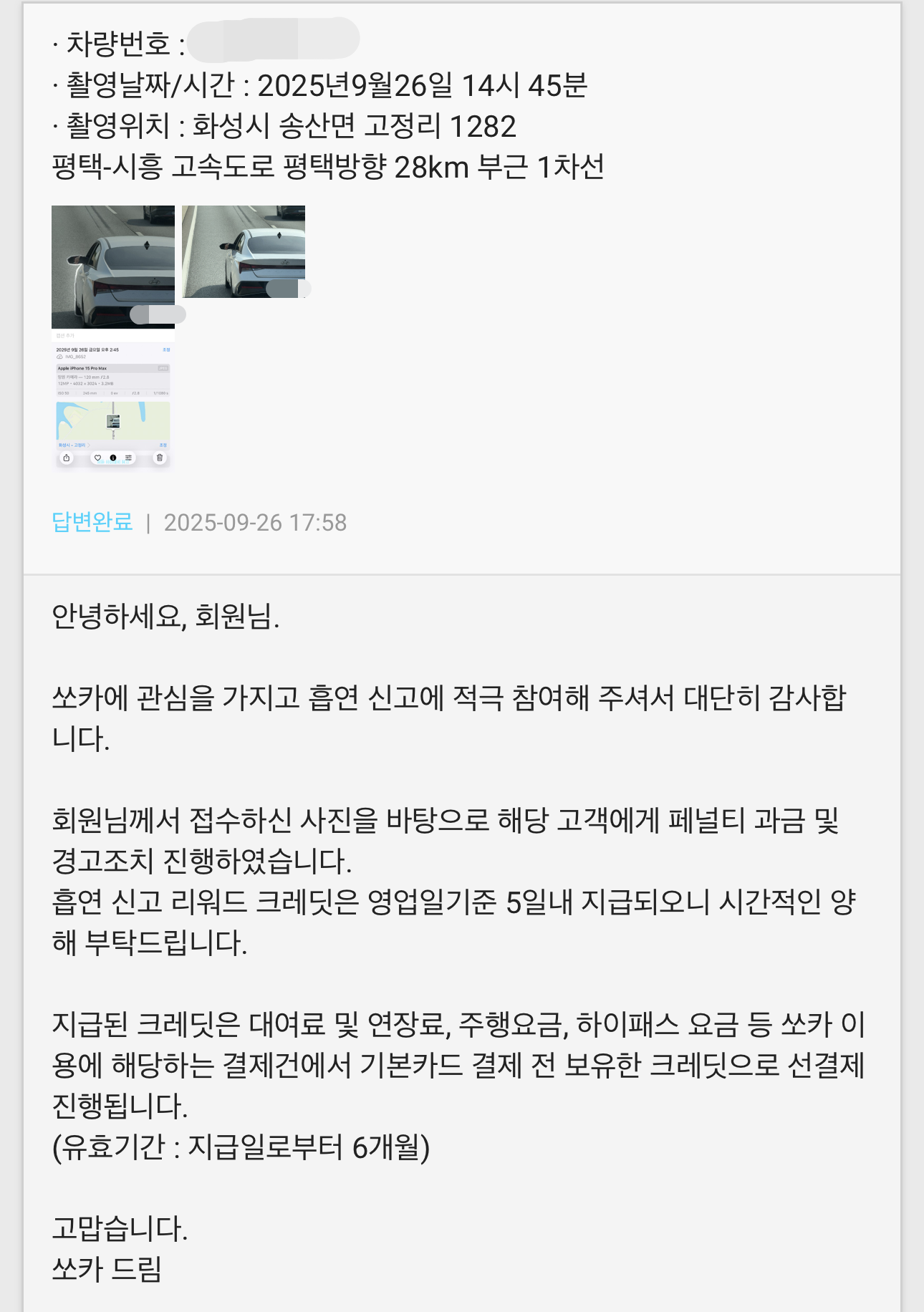 지난달에 제2서해안고속도로를 타고 내려오는데, 앞에 달리던 쏘카 CN7 한 대가 문을 열고 흡연을 하고 있었습니다. 작년에도 외곽순환도로에서 비슷하게 흡연을 하고 있던 쏘카를 발견하고 사진을 찍어 신고한 뒤 크레딧을 받았었지요. 당시 겨우 3만 크레딧을 지급해 줬었습니다만, 올해 9월부터 다시 흡연 신고 리워드 크레딧이 15만 점으로 인상되었다고 하네요.