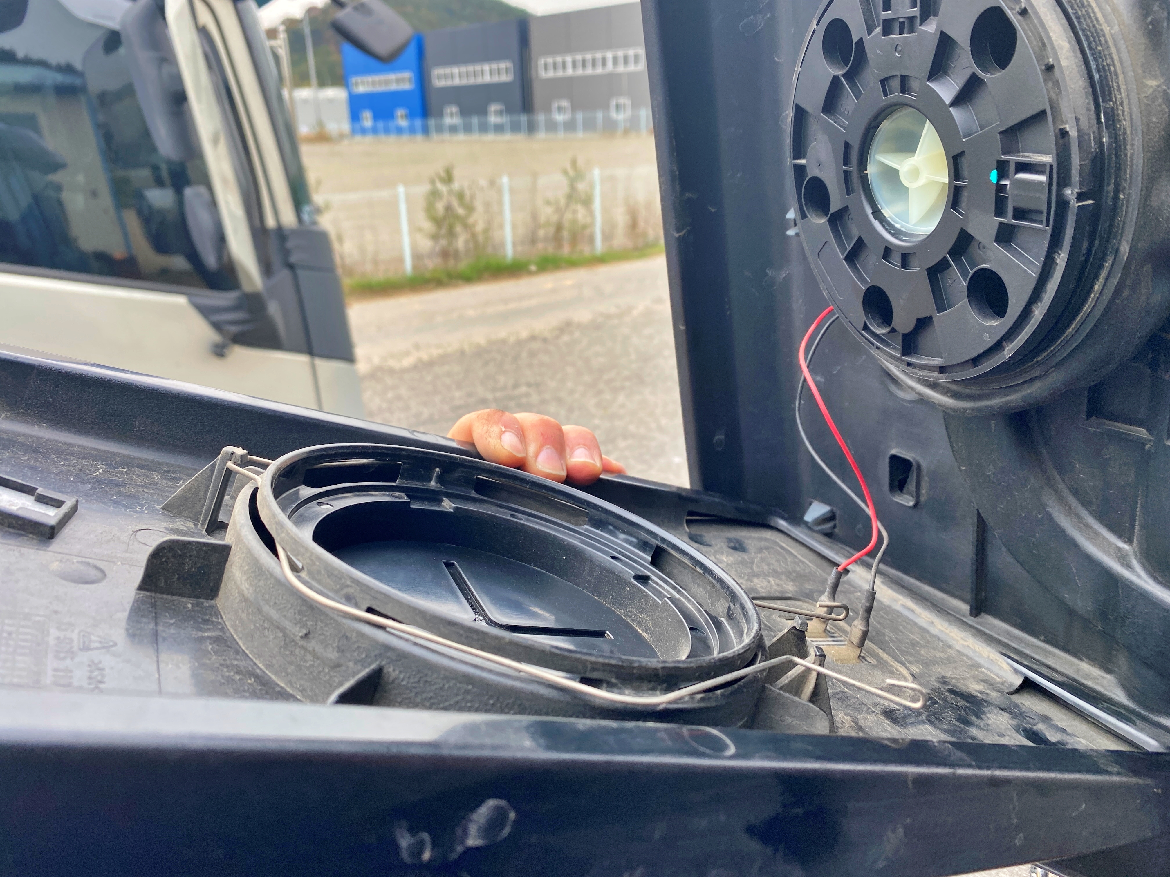 먼저 열선 배선을 끼워주고 저 동그란 사이드미러를 조정해주는 자리에 유리를 끼워주면 됩니다.