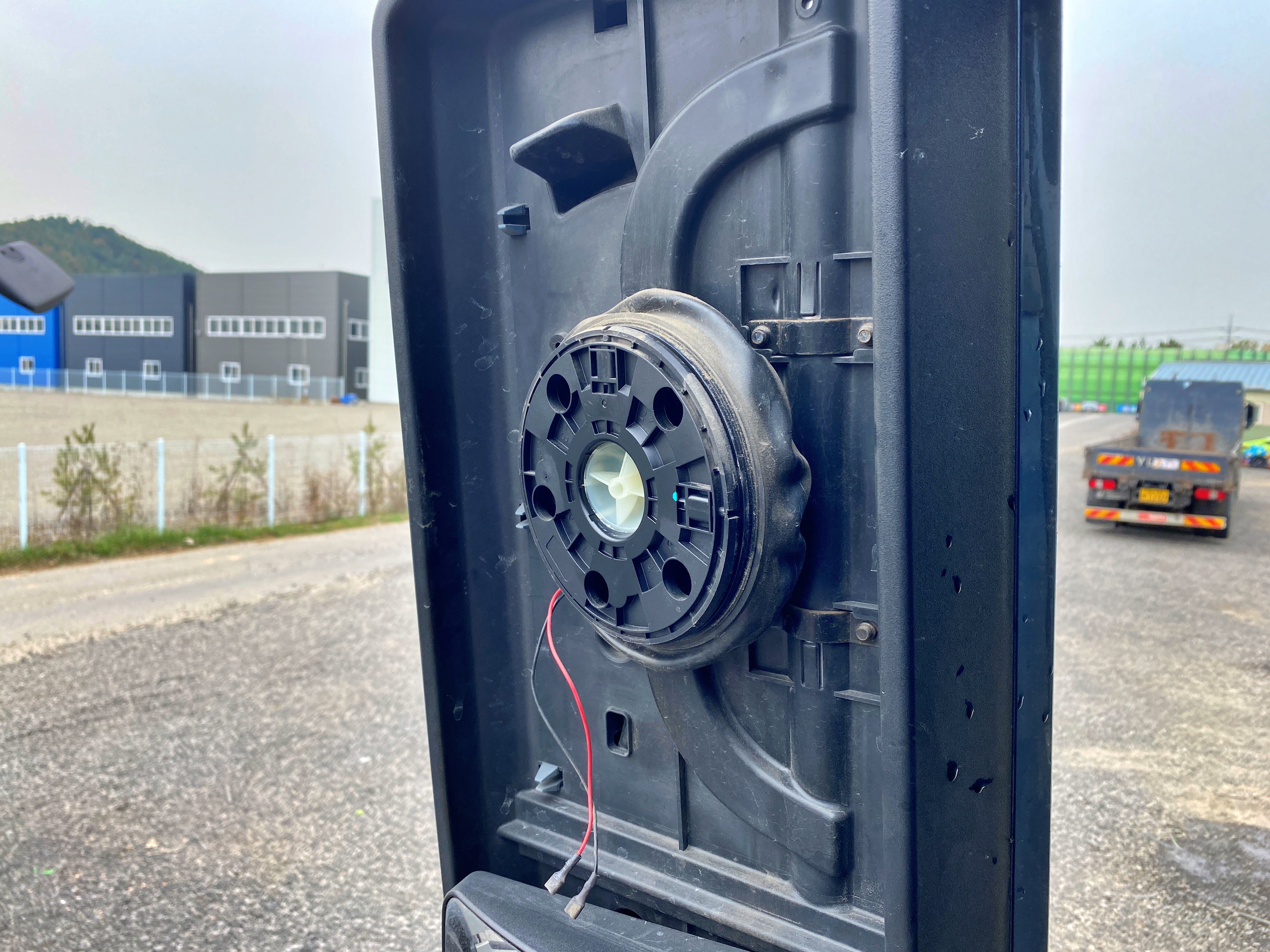 탈거합니다. 승용차와 같은 방법으로 탈거가 가능하네요. 거울을 한쪽으로 몰아 틈을 만들어낸 뒤 고정하고 있는 핀을 눌러서 풀고 잡아당기면 쉽게 빠집니다. 혹시나 구조가 다를까 걱정했었는데 다행스럽게도 승용차 사이드미러와 구조가 다르지 않습니다.