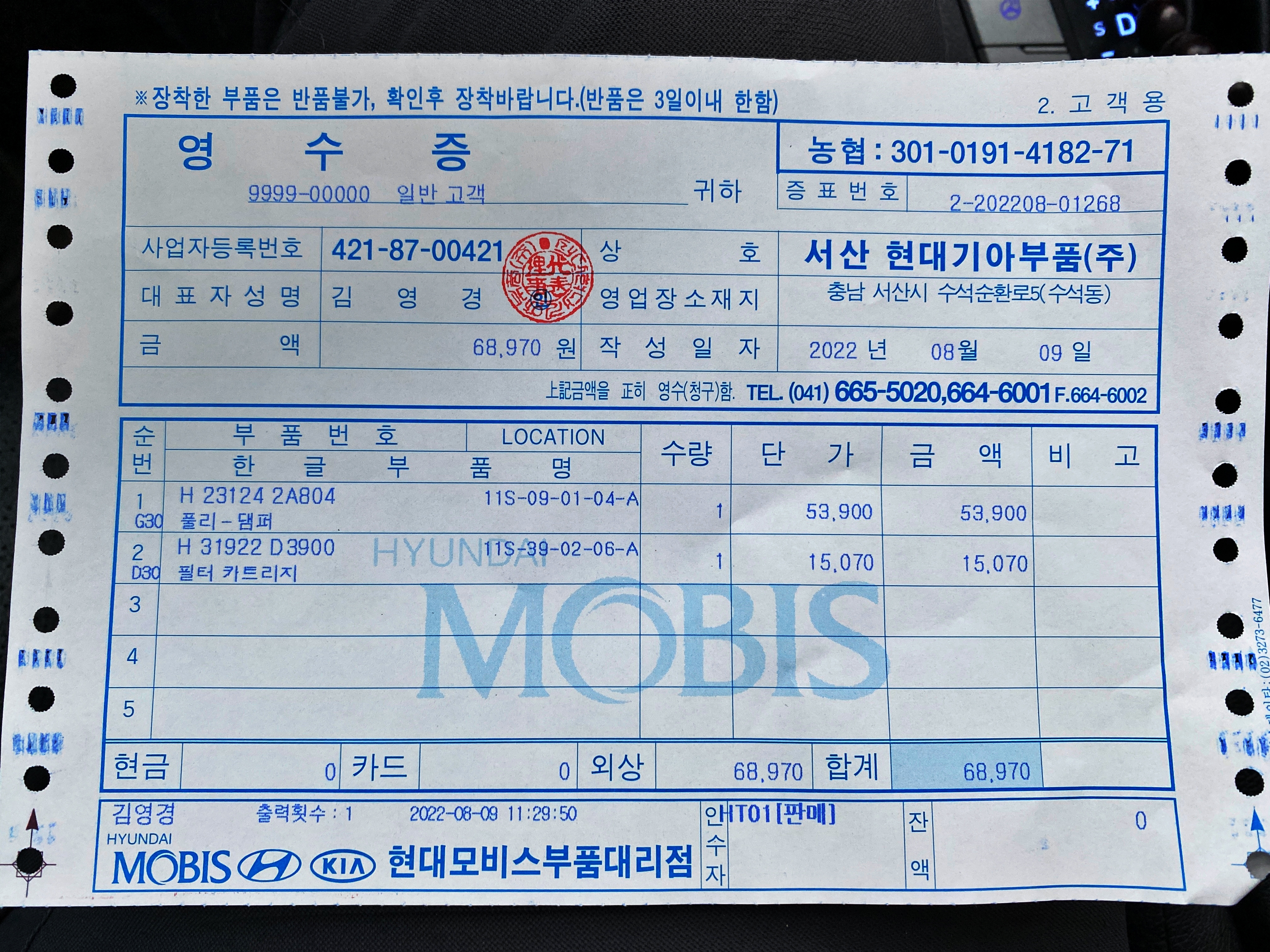 대충 모비스 홈페이지에서 품번으로 부품 재고를 조회하고 당진의 현대부품점을 찾았습니다.