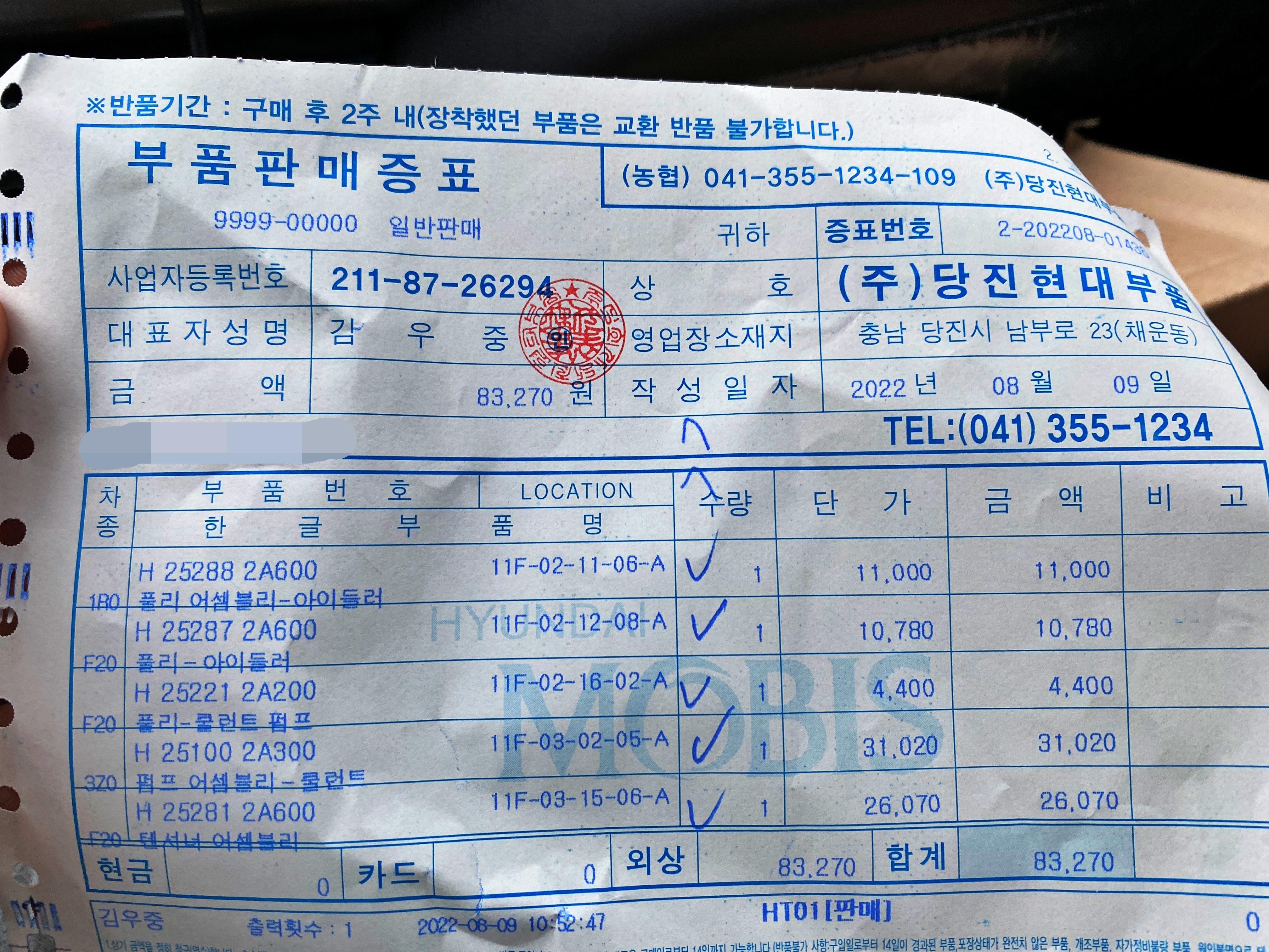 냉각수 빼고 부품은 다 가지고 왔으니 교체를 부탁드립니다. 중간에 엔진오일 예약 차량이 있어 그 차랑 작업을 병행하면 시간이 좀 더 걸릴지도 모르겠다고 했습니다만, 생각보다 빨리 끝났습니다.