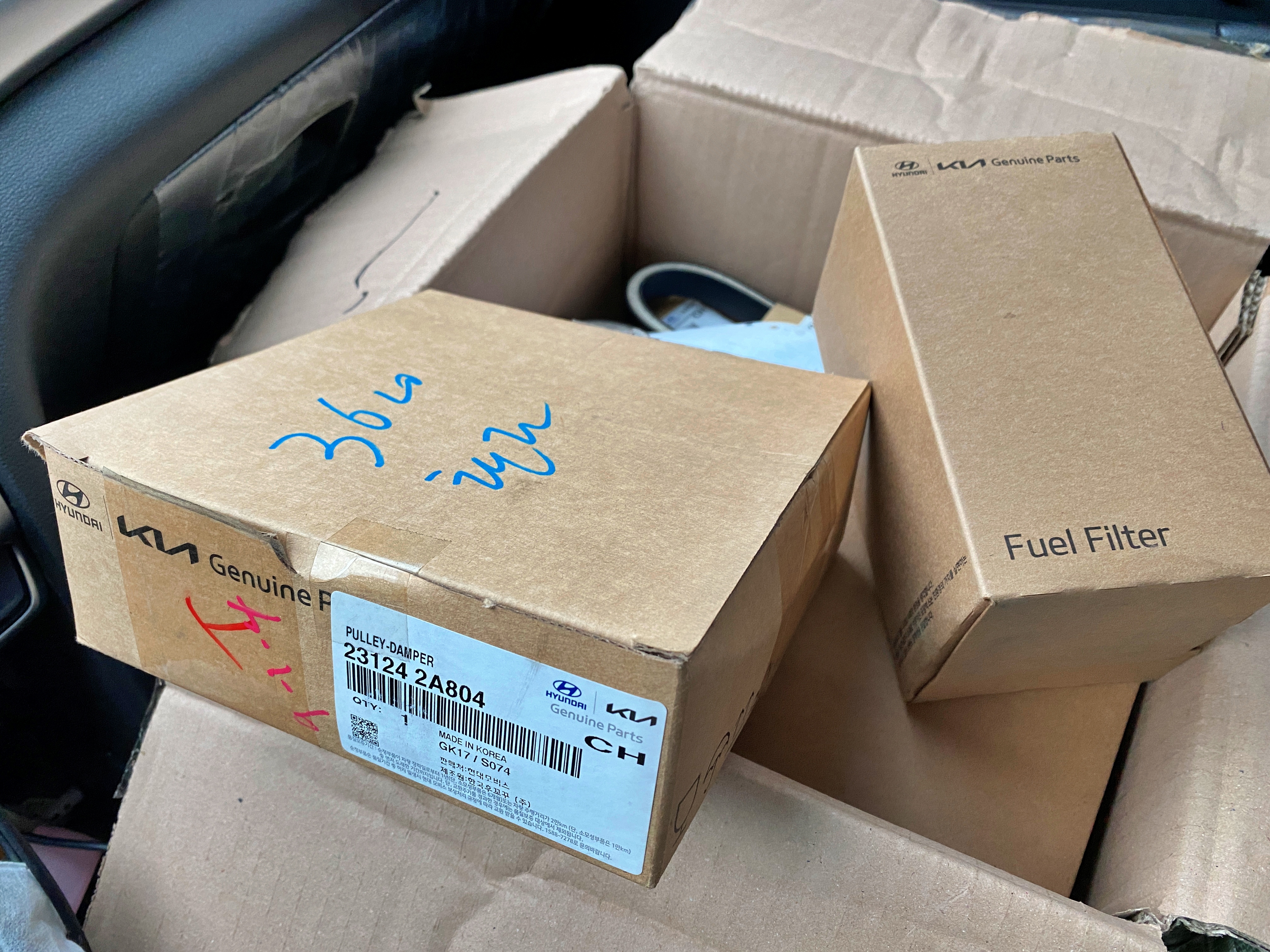그래도 U2엔진이 꽤 오래 판매되며 적용되었던 차량이 많아 전국 어느 부품점을 가도 최소 1대분 이상의 부품은 가지고 있는 느낌입니다. 예상대로 전산에 잡히지 않던 댐퍼폴리 빼고 다 있네요. 신품 벨트는 중국산. 그 외 나머지 부품들은 죄다 국산입니다. 디젤차라 휘발유차 대비 가격이 비싼 축에 속합니다.