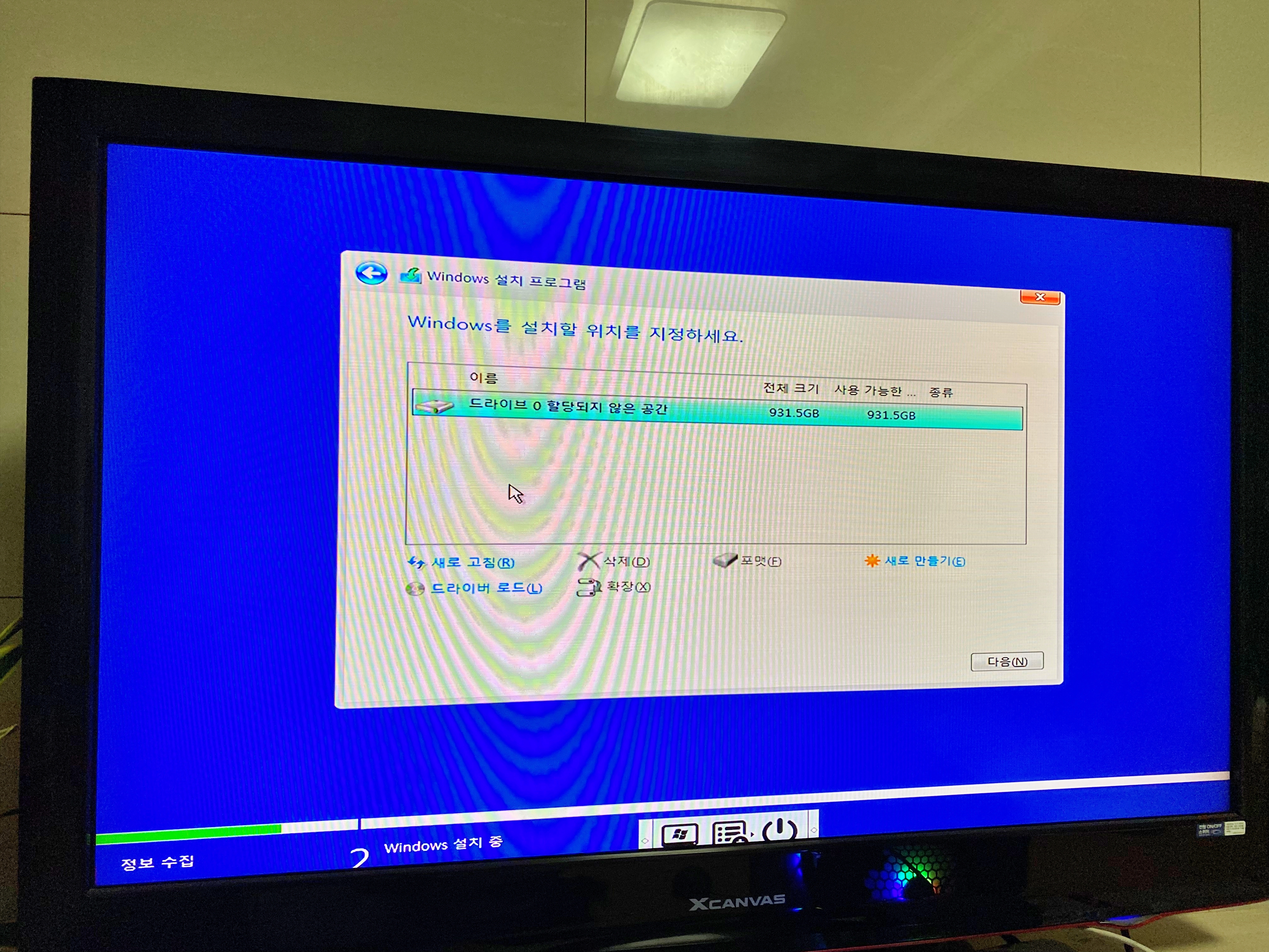 뾱뾱이를 제거하고, 전원을 넣어 작동시켜봅니다. 일단 거실에서 뜯었기에 거실 TV에 연결하여 초기 설정을 마쳐줍시다. 당연히 OS는 포함되지 않은 물건인지라 미리 윈도 11 부트 USB를 만들어뒀습니다. 윈도우를 설치하고 기타 필요한 유틸리티를 모두 설치한 뒤 방으로 가져갈 계획입니다.