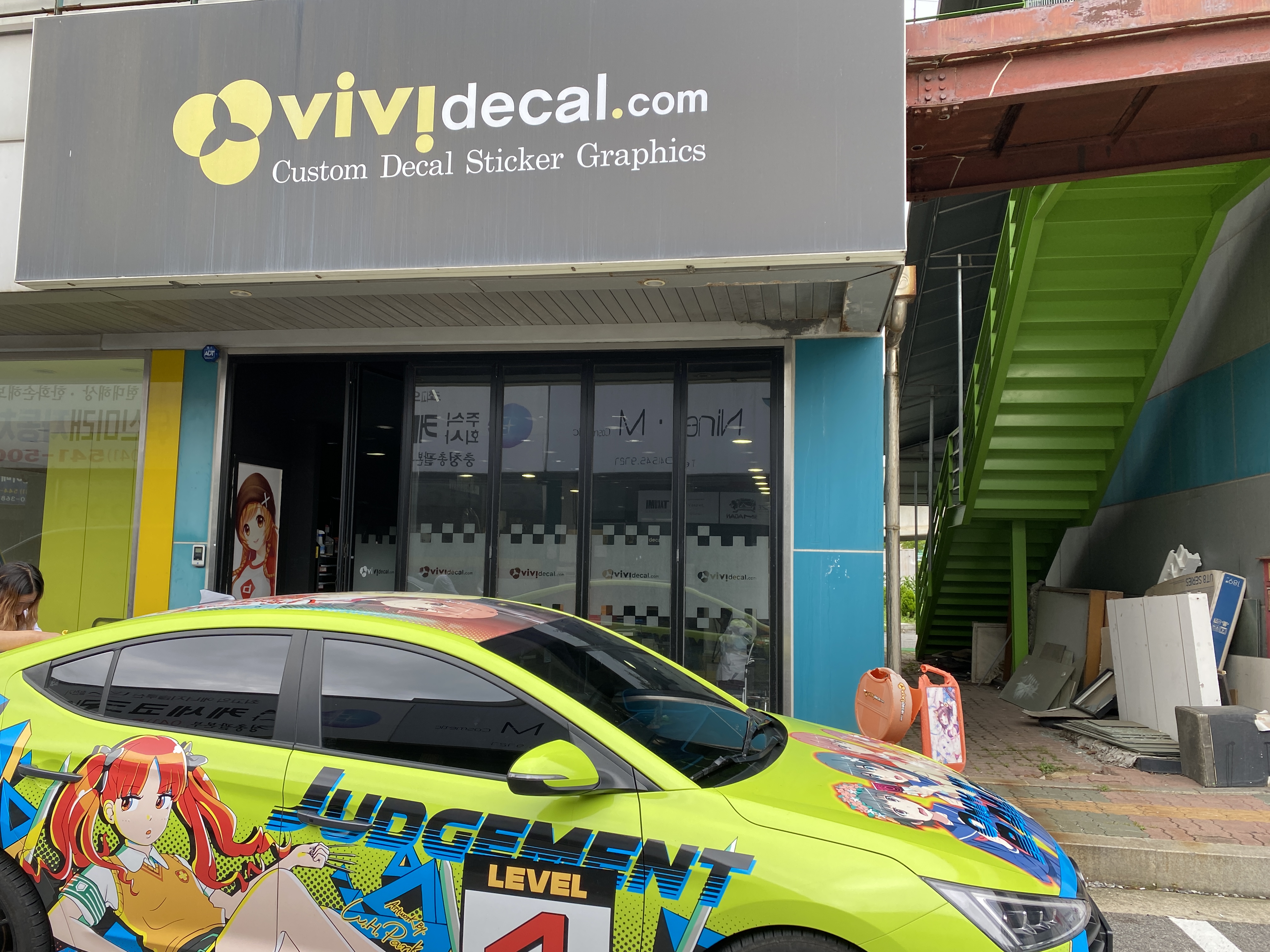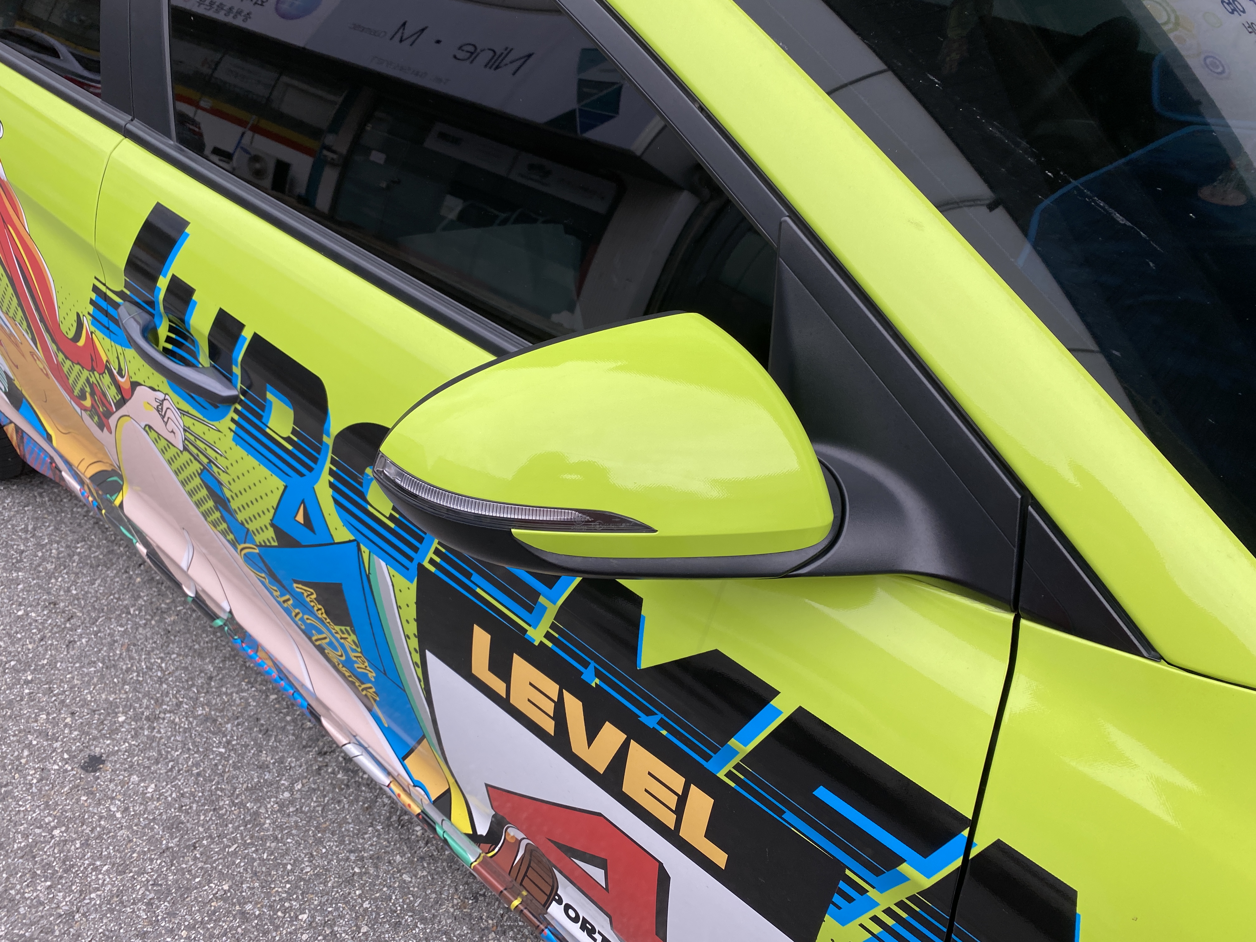 그간 한쪽은 차량 본래 색상인 아이언 그레이. 또 한쪽은 이전의 빨간색 랩핑이 된 상태로 다녔었는데 이제 완전히 형광 연두색 삼각떼로 태어났습니다. 아 이제 좀 만족스럽네요.