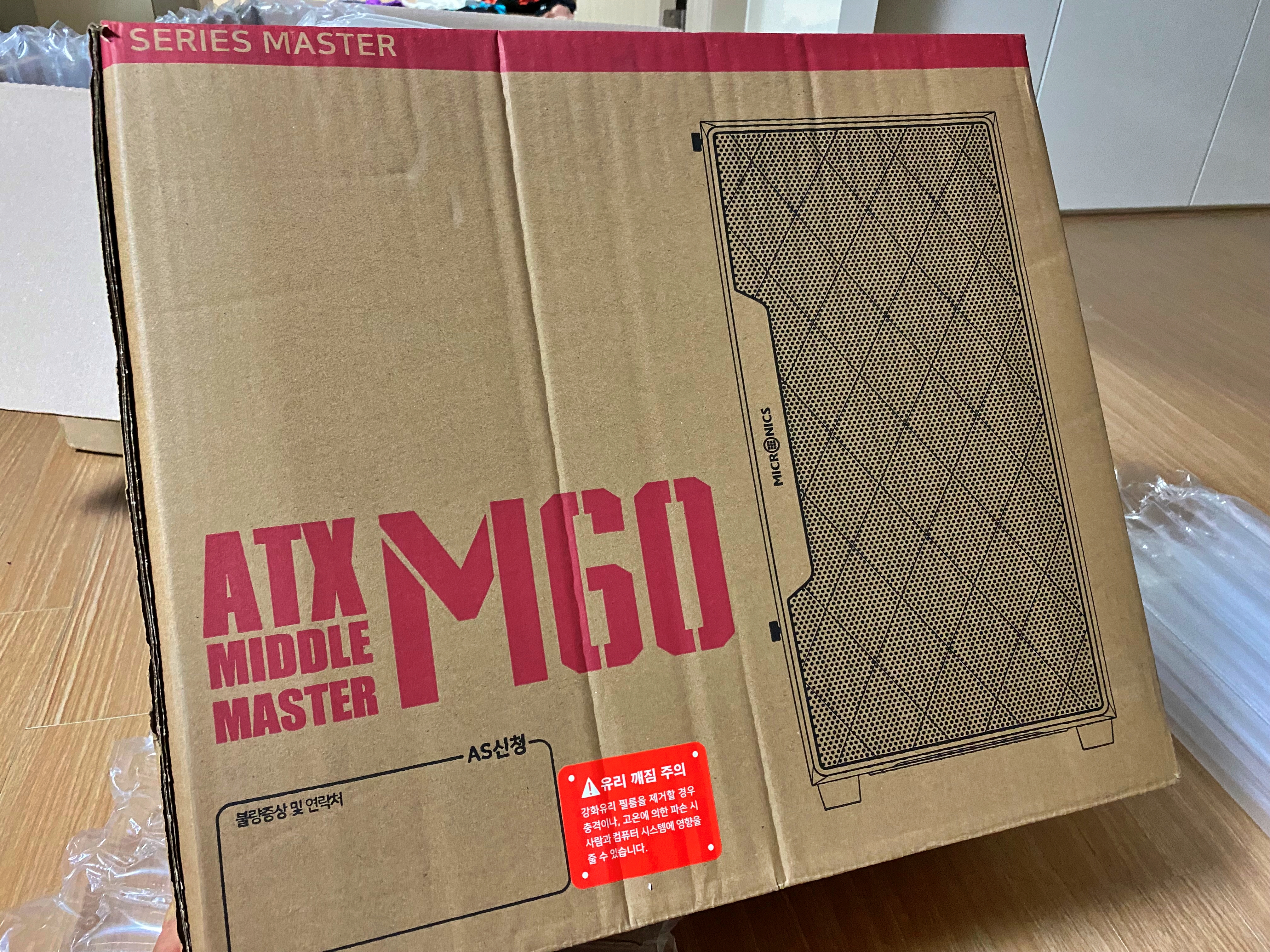 사실 케이스 좋은거 쓸 생각은 없어서 쿨러 달리고 불 들어온 제품 중 가장 저렴한 물건을 택했습니다. 마이크로닉스 M60 블랙입니다. 조심스럽게 케이스를 뜯어봅니다.