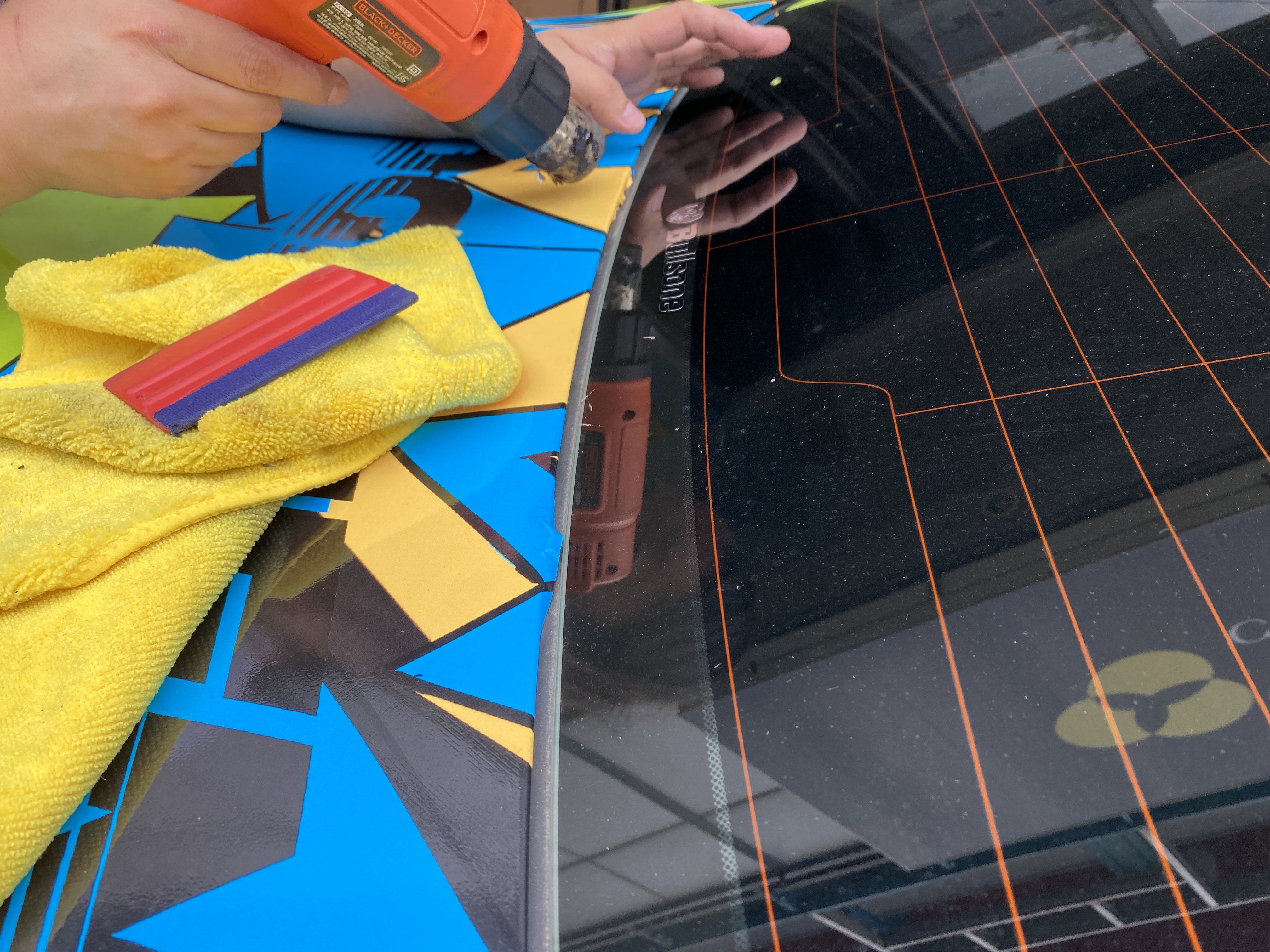 트렁크 위 끝단이 말려서 올라오던데, 시간이 오래 지나 완벽한 상태로의 복원은 어려워도 주름이 좀 잡혀있기는 하지만 90% 수준까지 복원을 마쳤습니다. 보수용 접착제를 바르고 히팅건으로 열을 가한 뒤 잘 붙여주면 됩니다. 그래도 다행히 잘 붙네요.