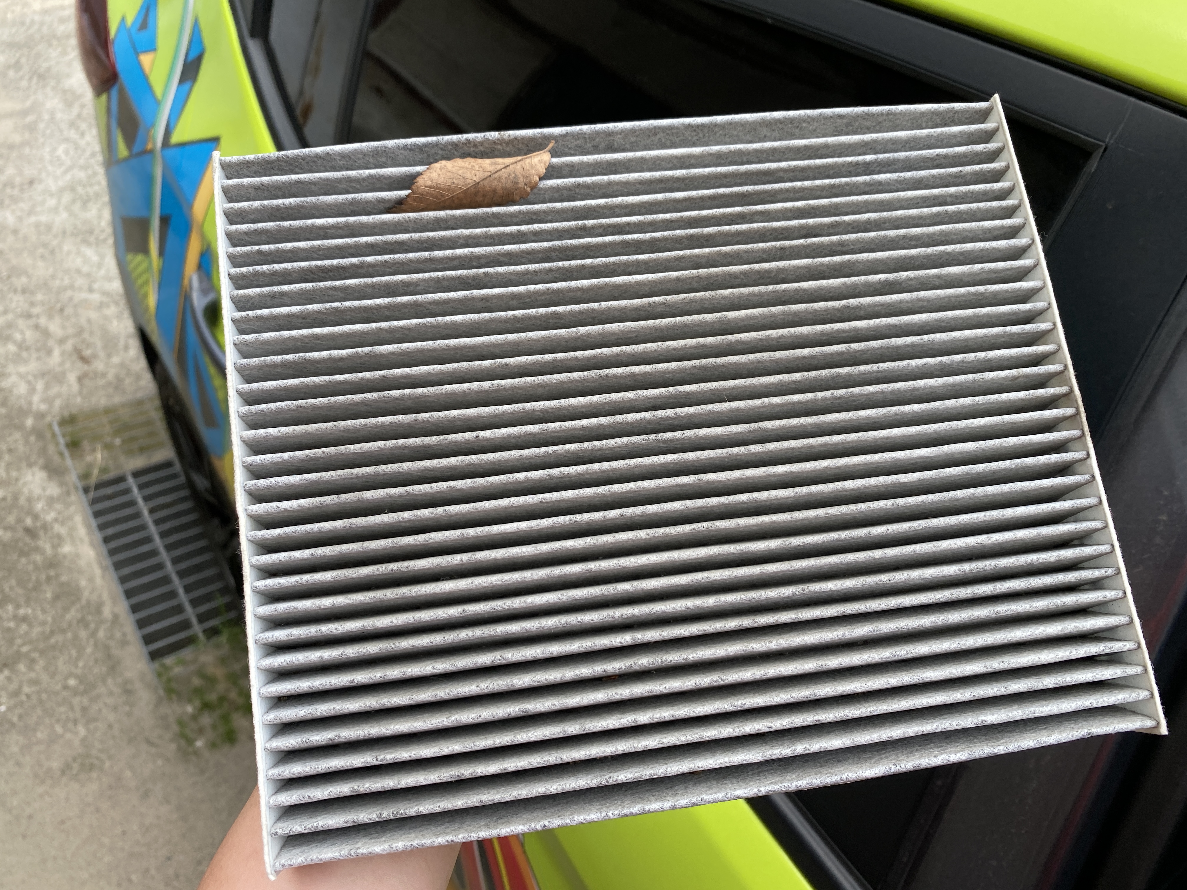 신차 출고 3주년을 기념하여 21년 12월 26일에 교체해줬군요. 이후 6개월 조금 넘은 시점에서 새 필터로 교체하기 위해 꺼냈습니다. 1년 주기로 교체하던 시절에 비해 오염도는 덜합니다만, 낙엽도 필터 위에 걸러져 있고 사진으로는 잘 보이지 않아도 육안상 흙먼지가 끼는 등 오염된 부분이 보입니다.