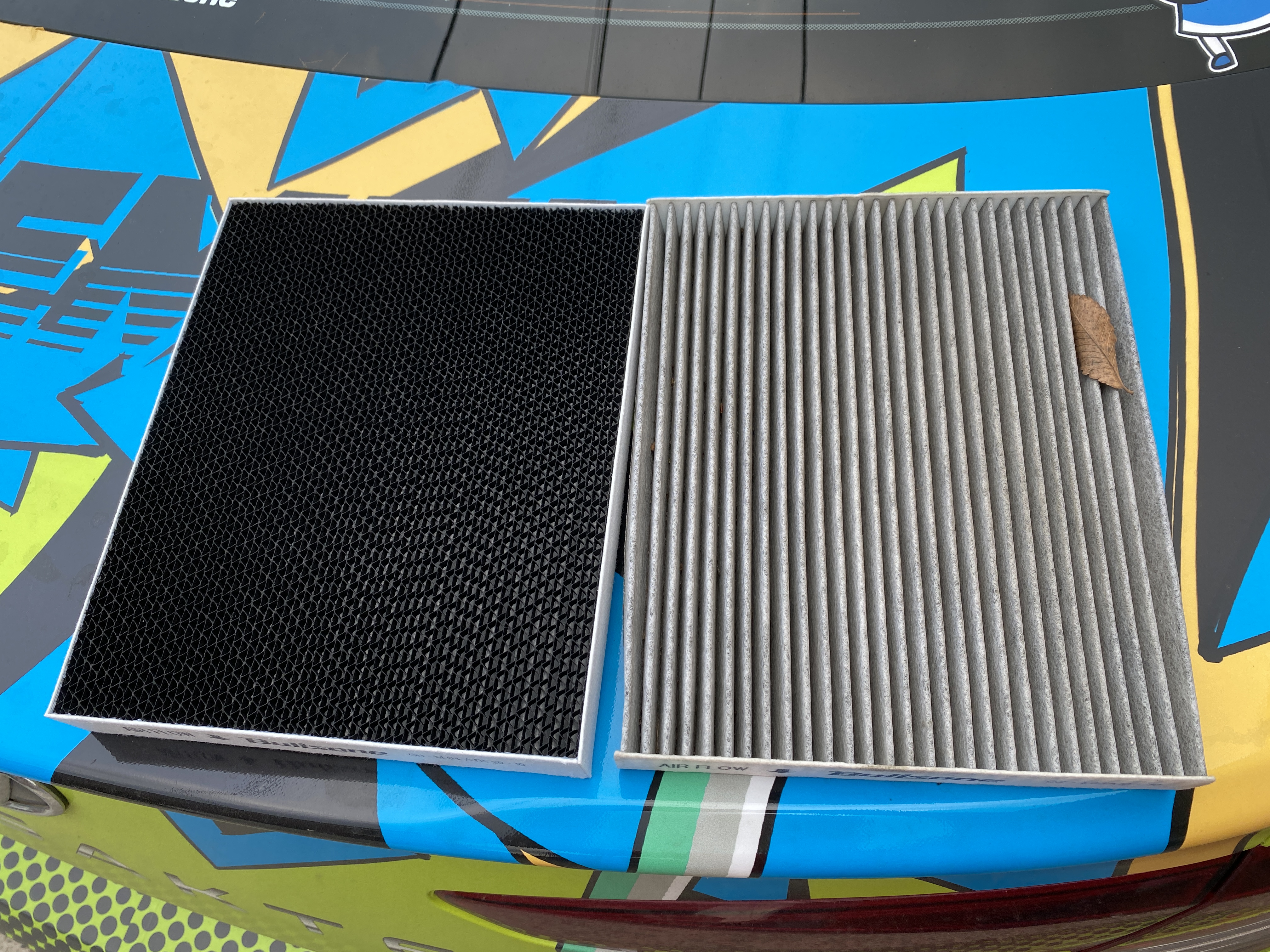 생소합니다만, 일반적인 가정용 공기청정기에 사용되는 필터라고 합니다. 탈취와 유해가스 제거 효과를 가지고 있는 기능성 원단이라고 하네요. 콜게이트층을 아래로는 일반적인 활성탄 필터와 큰 차이는 없어보입니다. 여튼 약 6개월 이상 버틴 기존 필터를 제거한 뒤 새 필터를 뜯어 확인하고 교체하기로 합시다.