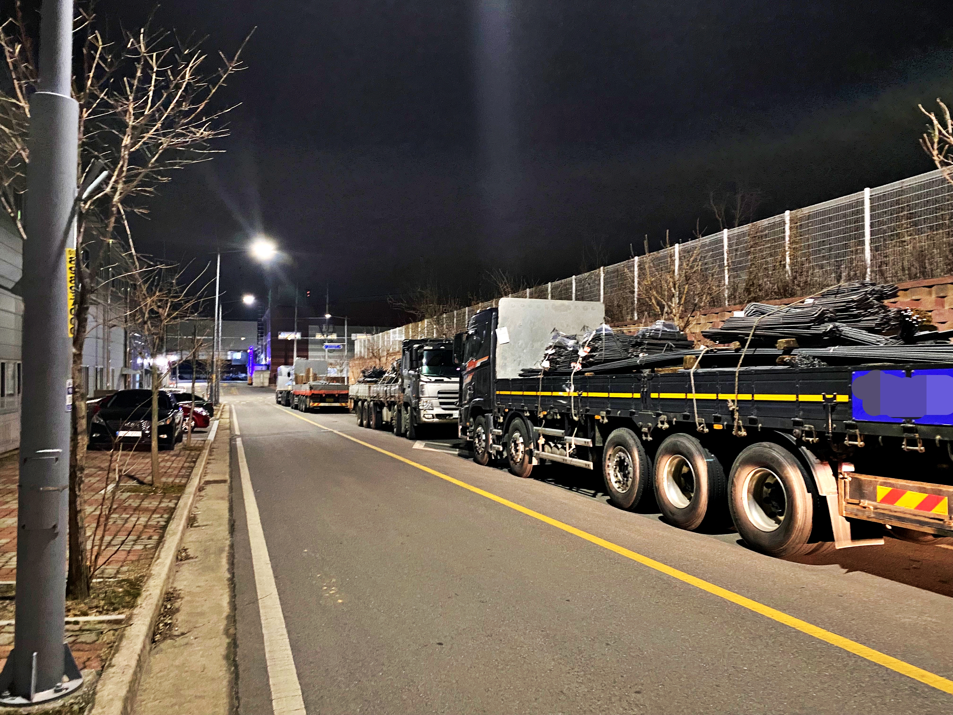 앞에 보이는 가공철근이 상차된 차량들은 새벽에 빠져나갈 겁니다. 트라고랑 엑시언트 새 차 말고 저 앞에 세워진 두대의 차량이 하차를 위해 대기하는 차량들입니다. 맨 앞 차량은 같은 공장 차량이고, 두 번째 차량은 동국제강 철근이네요. 일찍 와도 1등을 못하니 개탄스럽습니다만, 새벽에 2~3등을 노리고 오는 차량은 4등이라 더욱 절망스러울 겁니다.