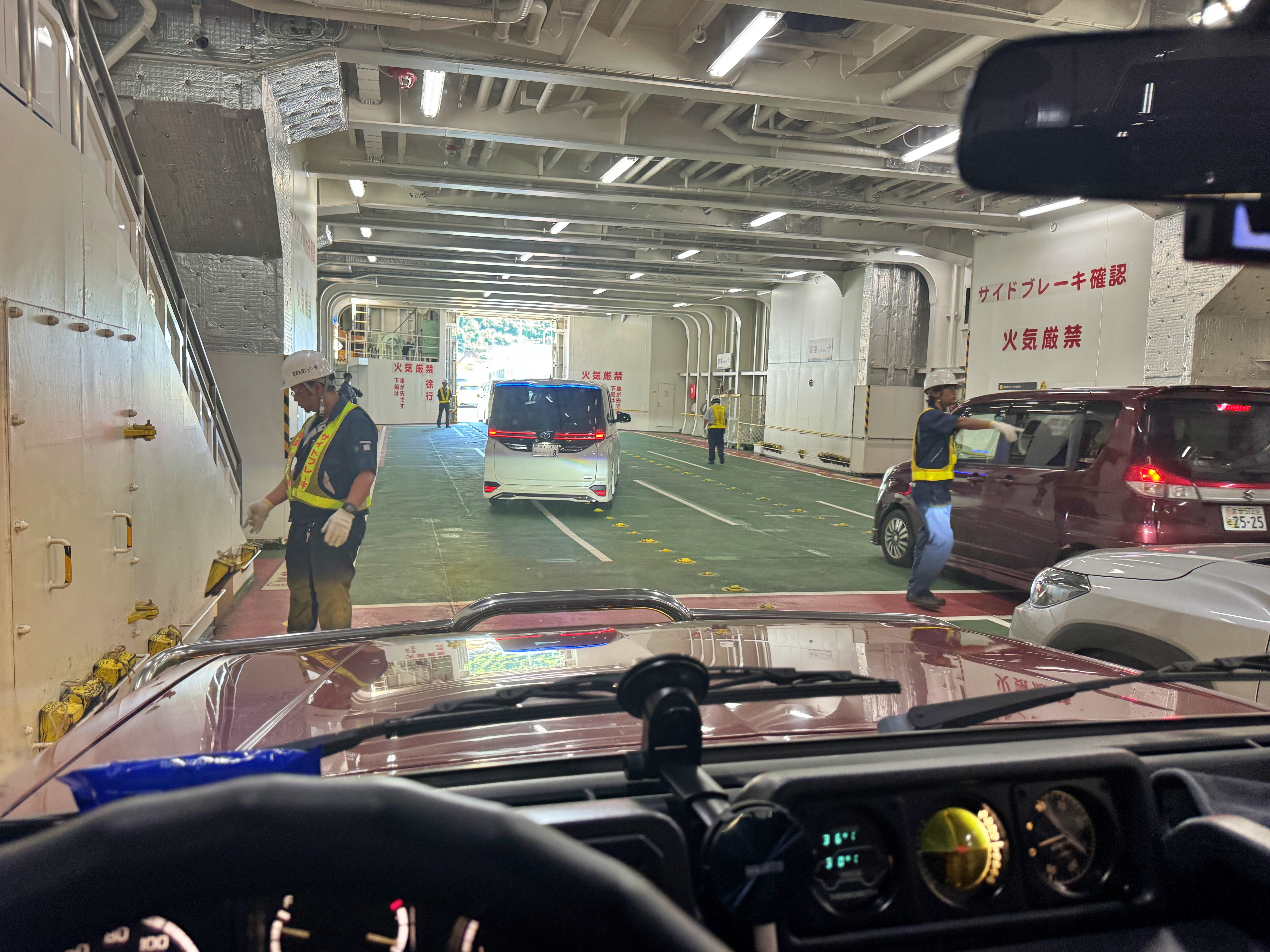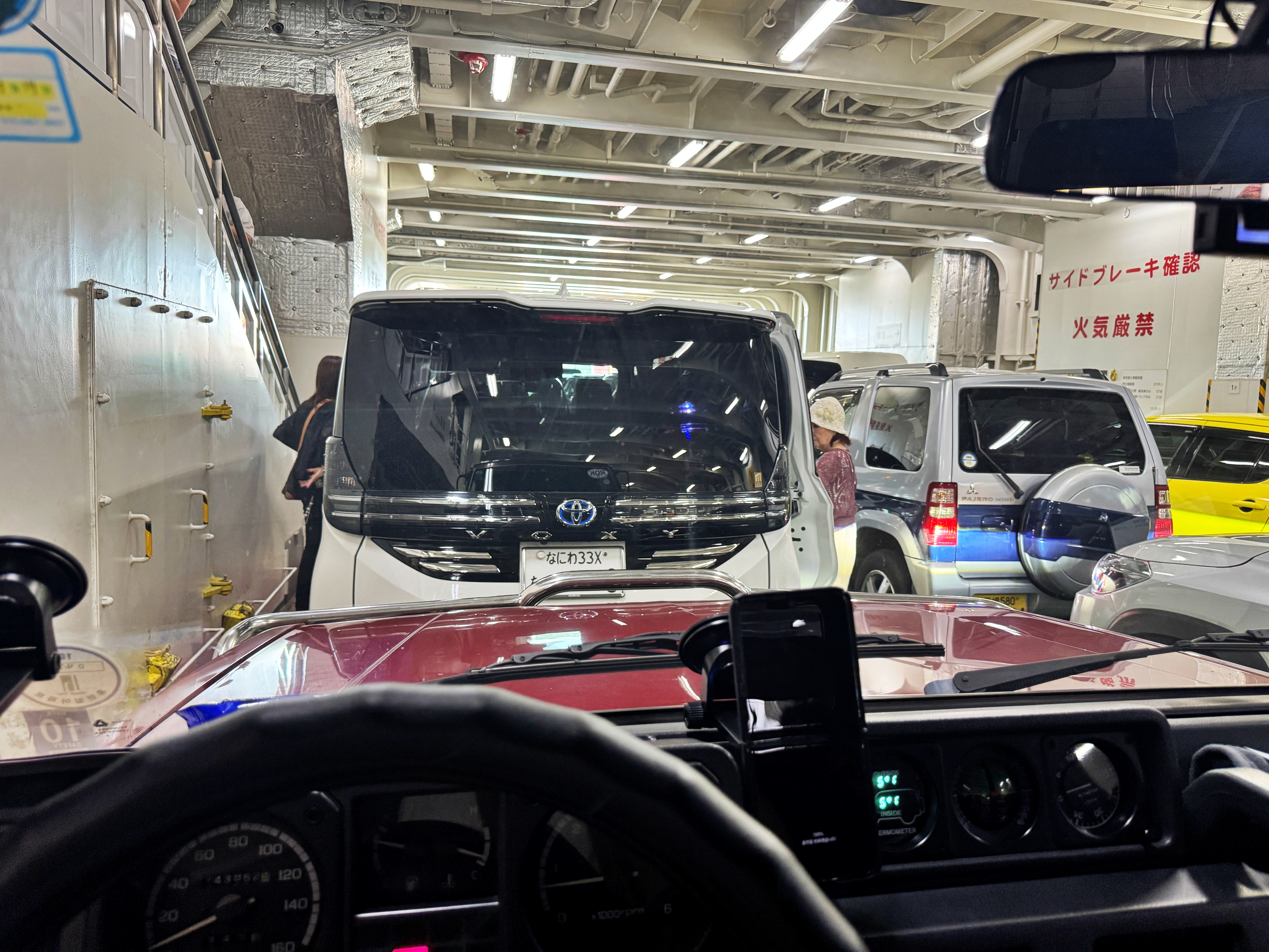 사진상 보이는 차량들만 봐도 와카야마랑 오사카 나니와 남바네요. 대부분 에히메나 오이타 번호판을 달고 있는 차량들이었지만, 백인 관광객의 시나가와 번호판 렌터카를 비롯하여 다양한 지역에서 온 차량들이 페리 탑승을 기다리고 있었습니다.