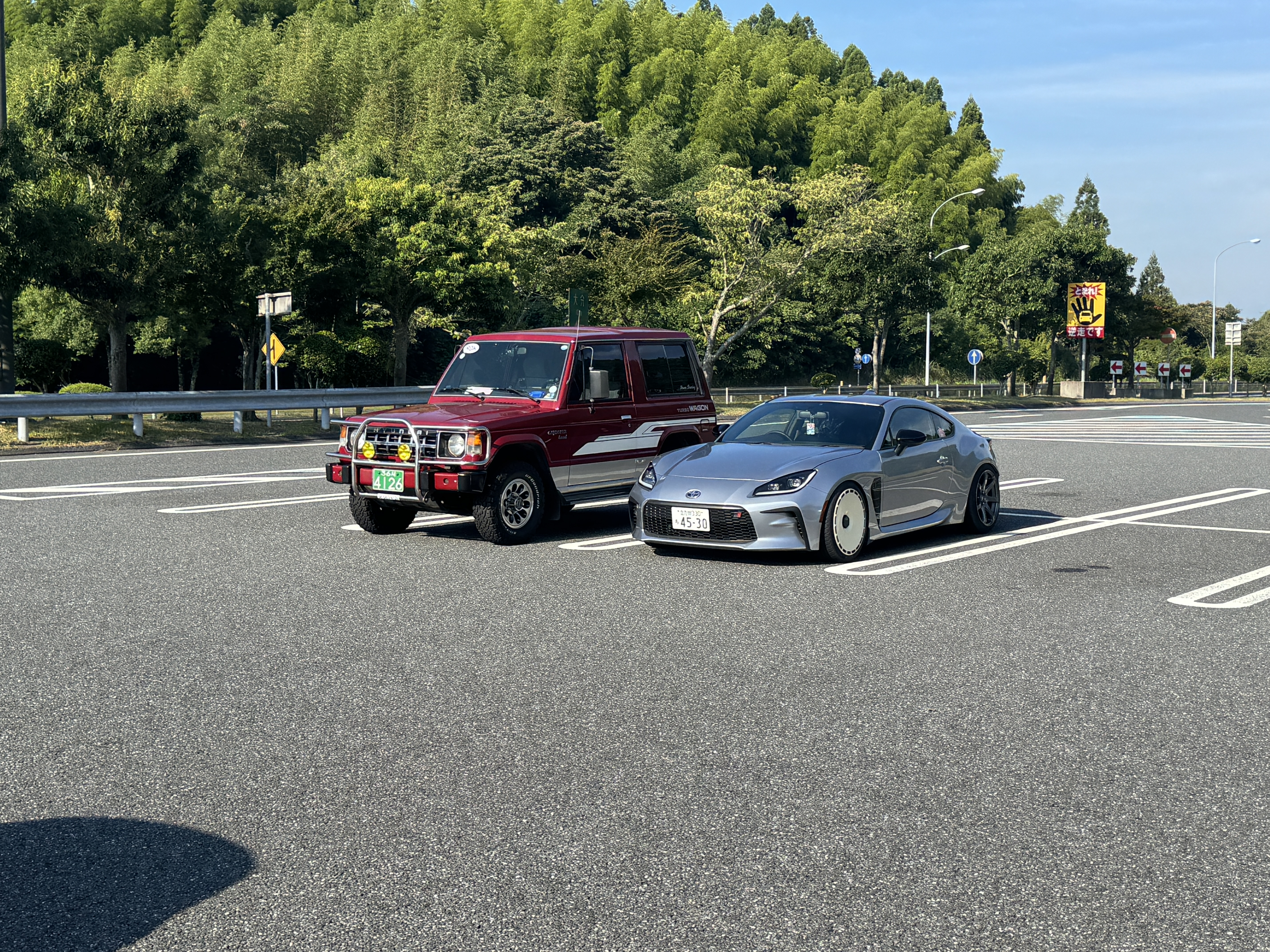 고속도로보다 시간은 약 15분 더 걸리지만 거리는 10km 이상 짧아집니다. 당연히 도로비도 덜 내고요. 저는 당연히 ETC가 없으니 일반 차로로 카지타카상의 GR86은 당연히 ETC가 있으니 ETC 차로로 나와서 기다리시는데 마침 같은 휠을 장착한 델리카 스타 왜건이 지나가더군요.