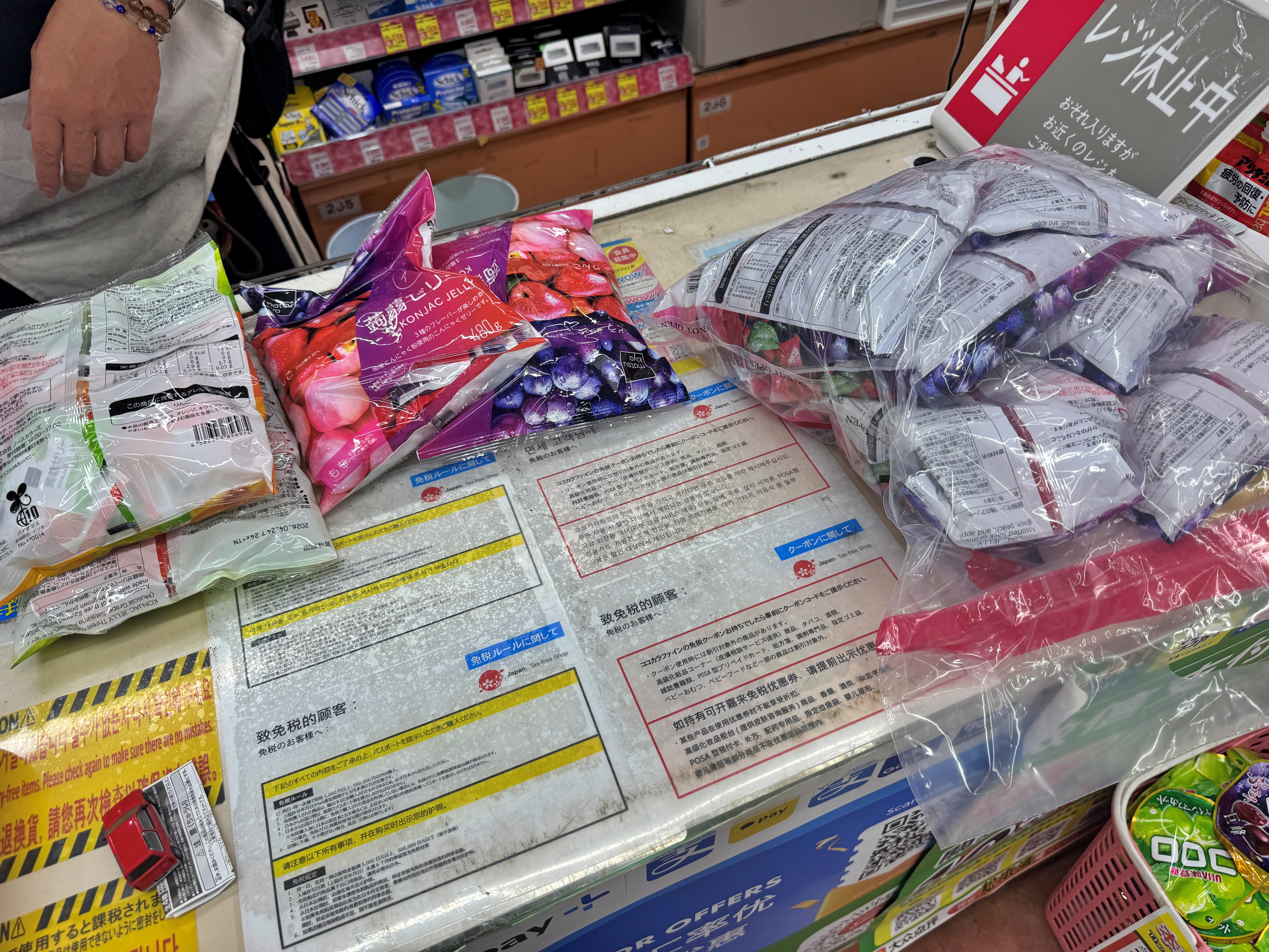 면세기준을 맞추기 위해 곤약젤리를 잔뜩 구입했습니다. 면세기준 맞추기엔 곤약젤리만큼 좋은 물건이 없지요. 비행기를 타고 왔더라면 기내반입이 어려워 힘들지만 어차피 차를 끌고 왔으니 상관 없습니다. 4000엔 이상을 곤약젤리로 채웠습니다.