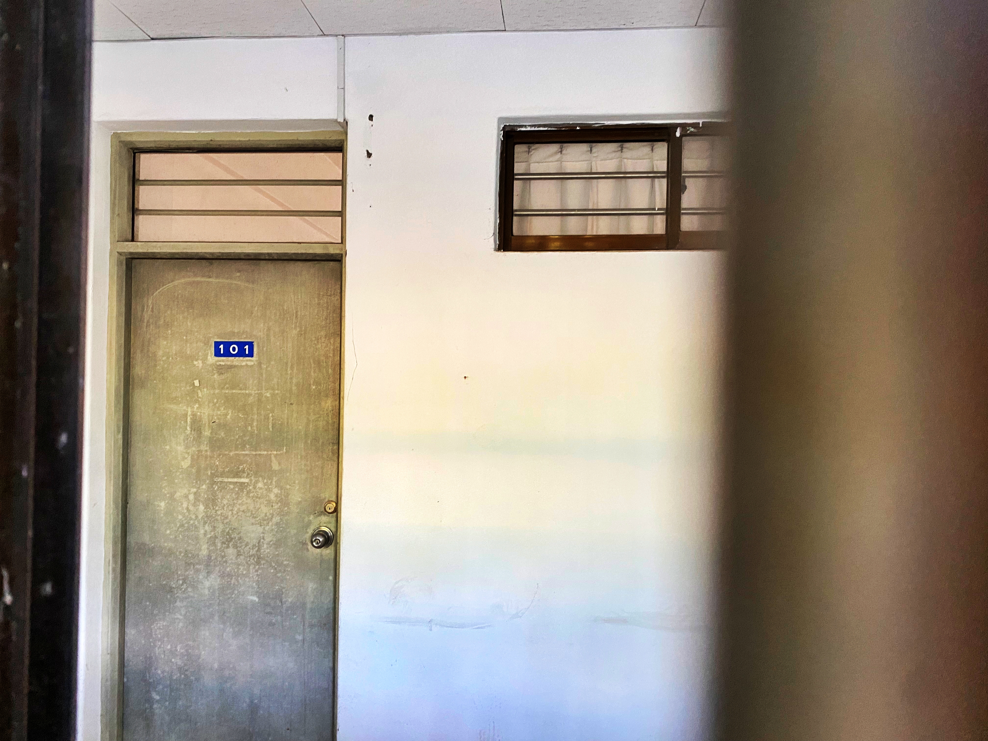 낡은 소화전과 낡은 벽 그리고 열려있는 강의실 뒷문입니다.