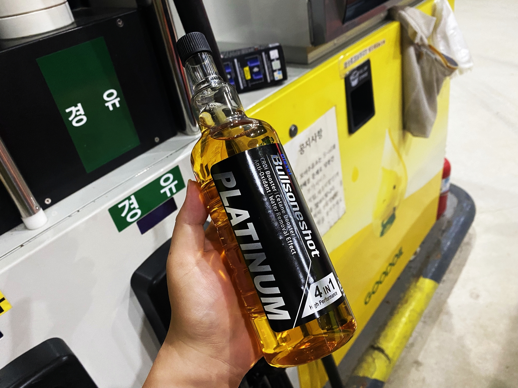 주유 이전에 넣어주고 주유를 진행해야 잘 섞이겠지요. 주유 후 주입해도 상관은 없다고 합니다만, 그래도 잘 섞이라고 항상 주유 전에 주입합니다. 주유 전 기회를 놓쳤다면 그냥 다음 기회에 주입합니다. 마지막 한 방울까지 탈탈 털어 넣었네요.