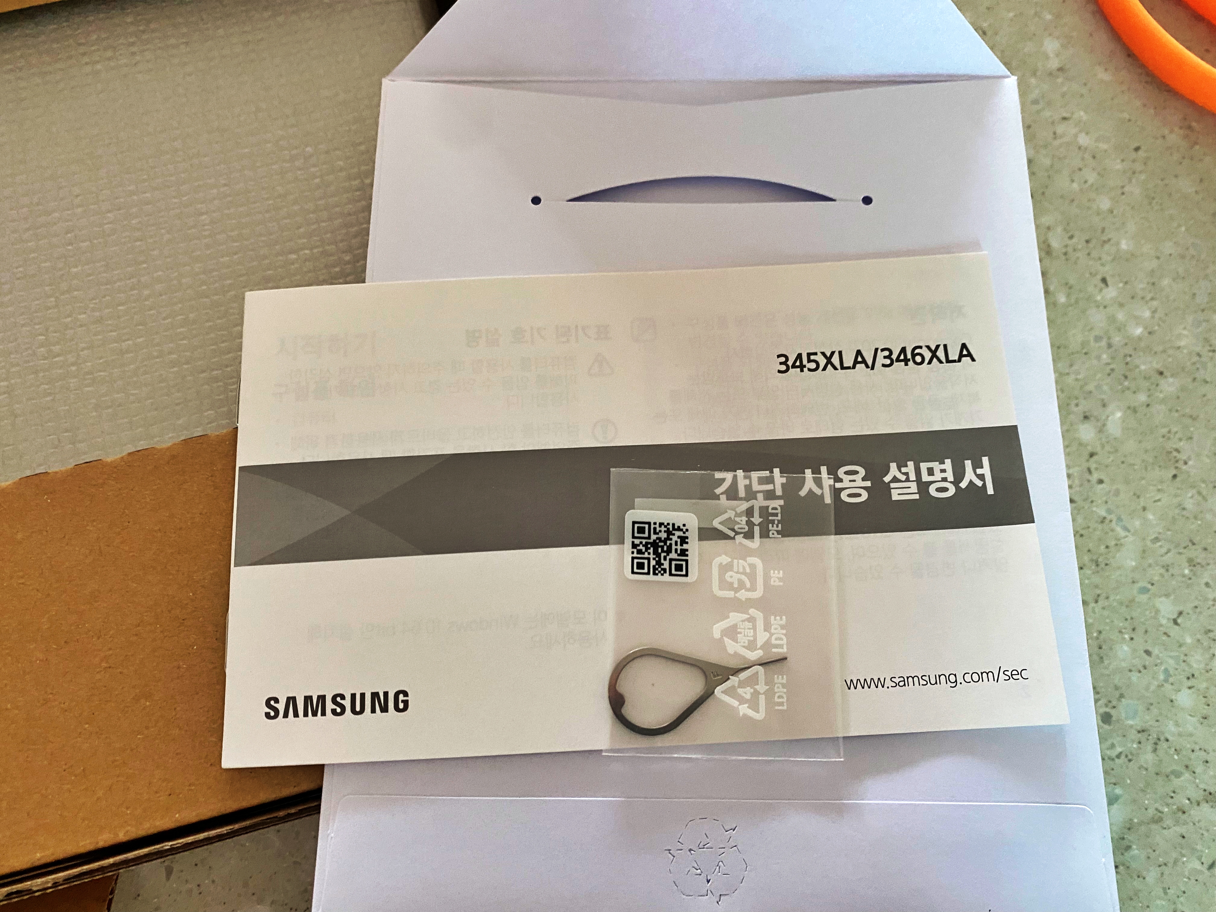 처음에 전원이 켜지지 않아 간단 사용 설명서를 정독했습니다. 그냥 전원버튼을 누르면 켜진다는데, 그래도 켜지지 않아 혹시 방전되었는지 싶어 충전기를 물려 켜보니 잘 켜지더군요. 익숙한 유심핀은 아시다시피 유심 트레이를 꺼내기 위해 사용하는 물건입니다.