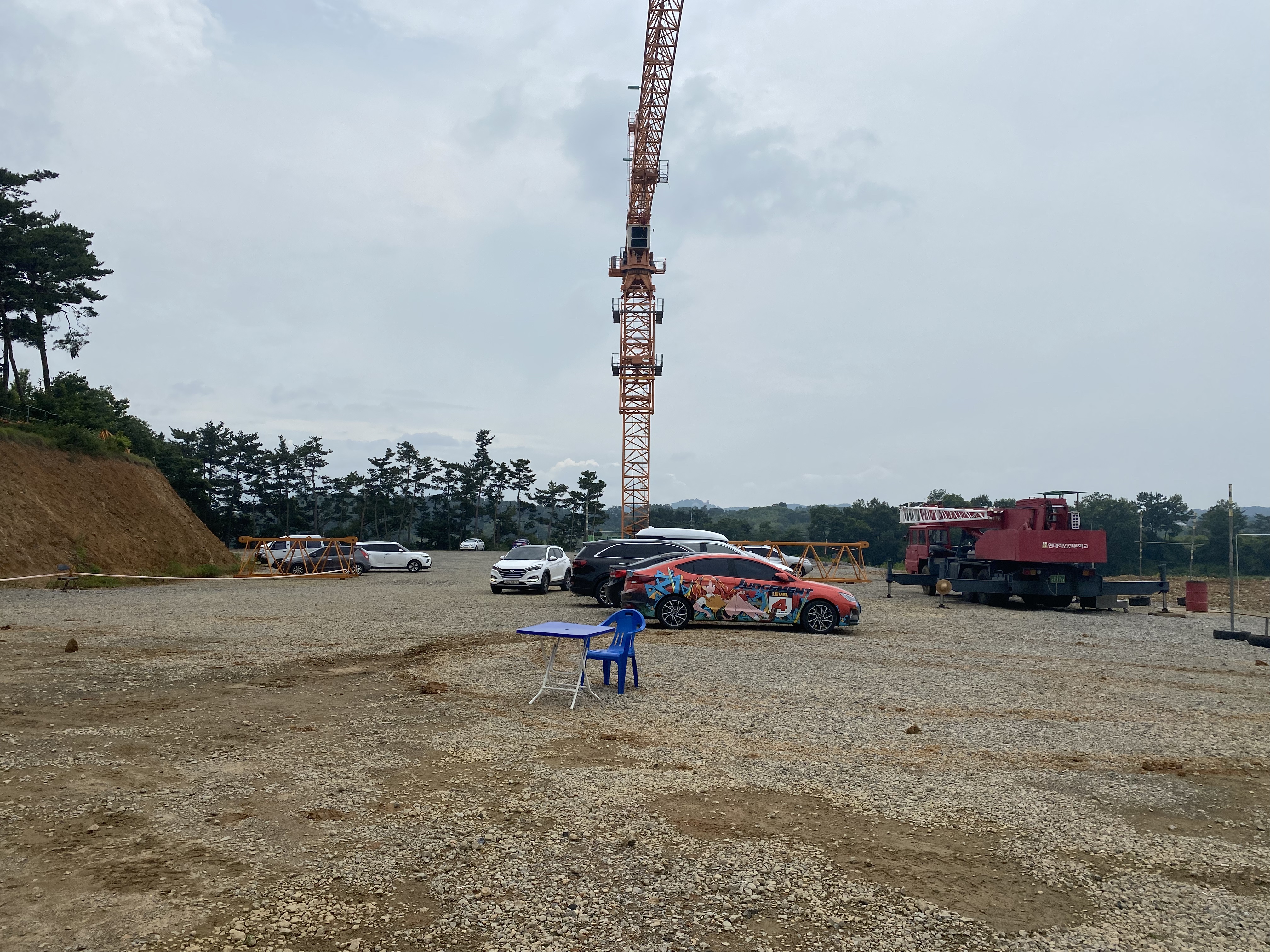 굴삭기는 주행과 작업으로 나뉘어 시험을 보고 지게차는 그냥 코스만 돌면 됩니다. 타워크레인 주변으로 응시생들의 차량이 주차된 상태입니다. 지게차는 오전부터 꾸준히 시험이 있어 대략 한시 조금 넘어 시험장에 갔음에도 이전시간 수험생들이 열심히 시험을 보고 있었습니다.