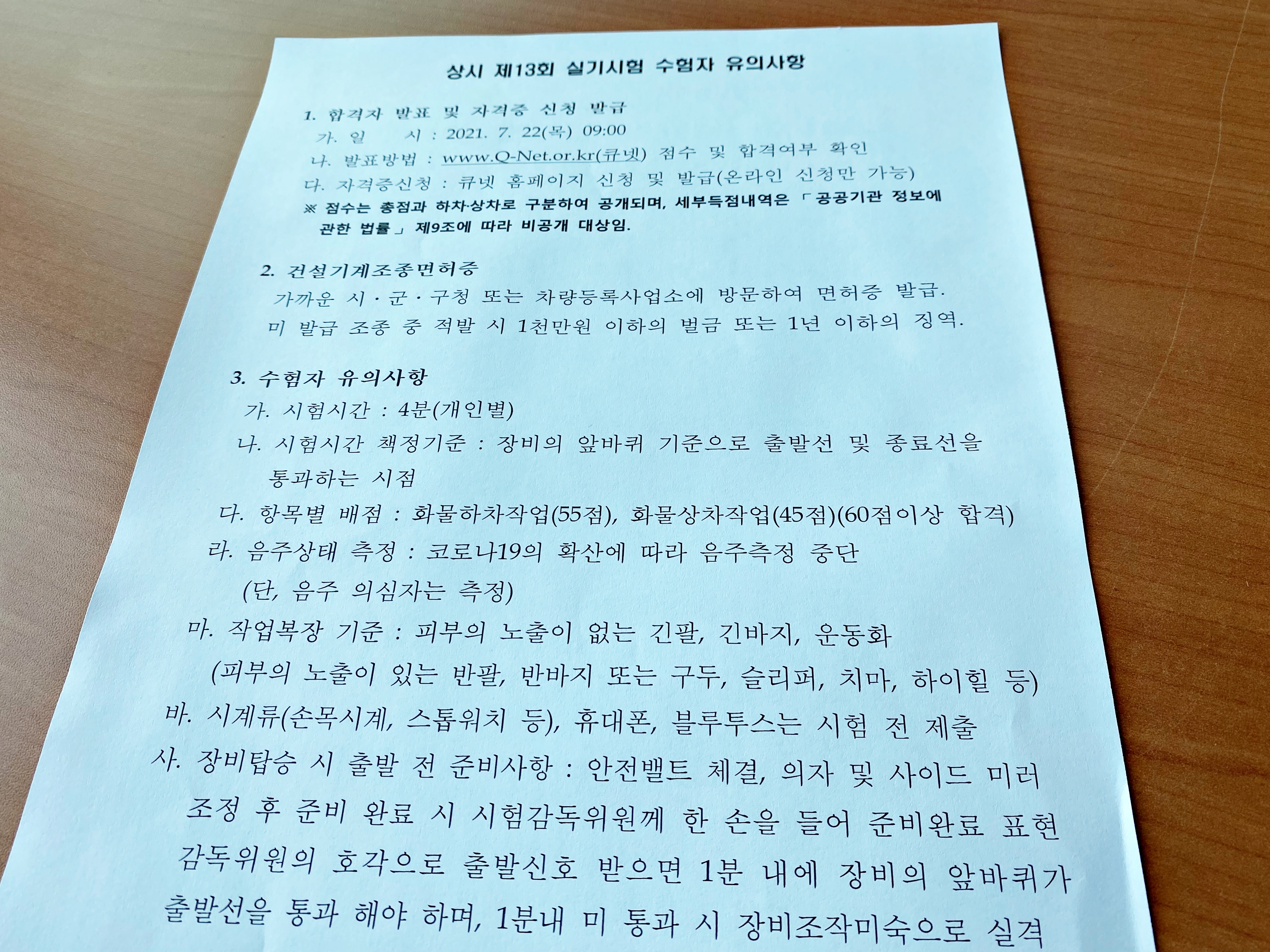 응시인원 13명 중 10번을 뽑아 대기합니다. 같이 배웠던 친구는 2번을 뽑아버렸네요. 그렇게 대기실에서 다른 응시생이 지게차를 타는 모습을 지켜보며 초조하게 기다려습니다. 친구는 작업구간을 빠져나오며 포크를 내리지 않아 실격당했습니다. 그 이후 주행중 선을 밟거나 시간초과로 실격당하는 응시생들이 있었고, 저는 포크 조정에서 조금 실수를 했긴 하지만 그래도 무사히 통과했습니다.