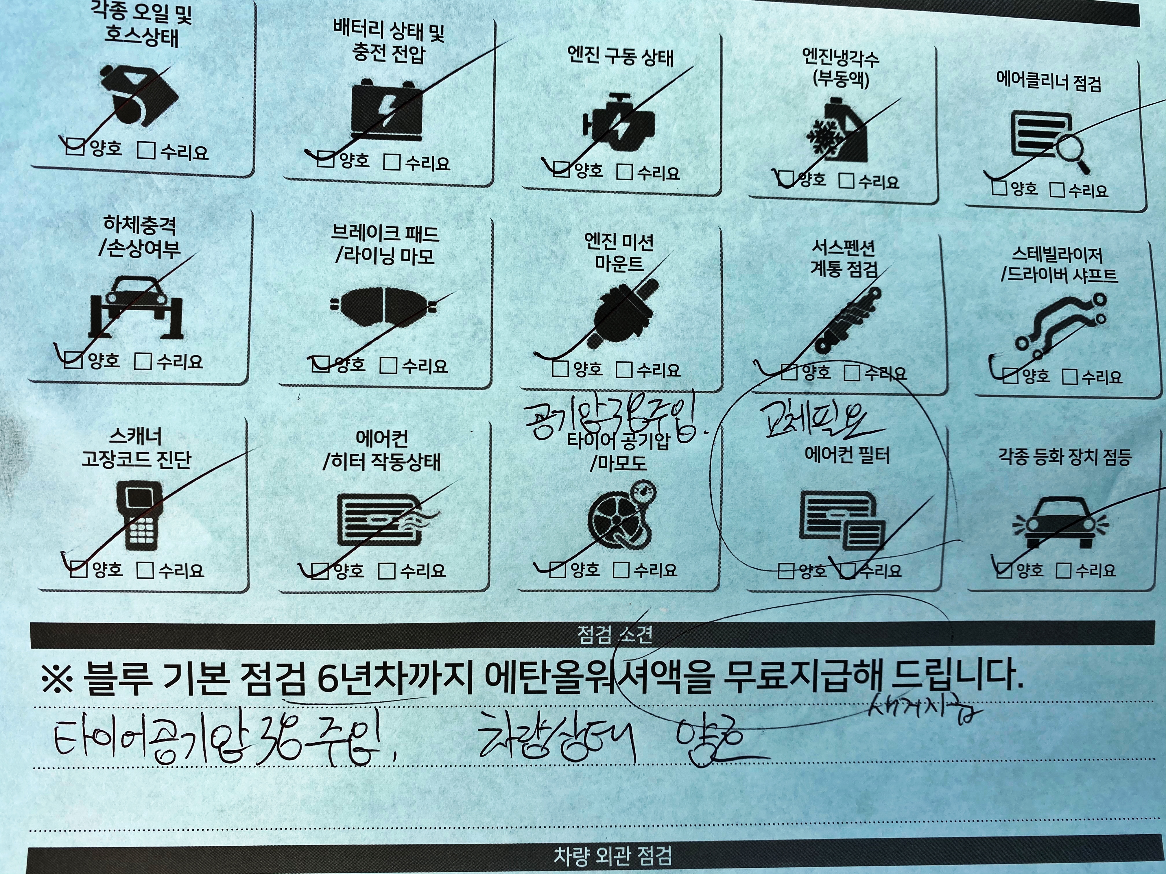 이제 뭐 정형화된 내용 적기도 귀찮습니다. 차 들어올리고 드레인 코크 열고 폐유 배출해주고 코크 닫고 내려서 신유 주입해주고 시동걸고 등등.. 다 생략하겠습니다. 새 오일을 주입한 뒤 다시 차량을 띄워서 전반적인 점검을 진행하더군요. 블루기본점검 2년차에 해당합니다.
