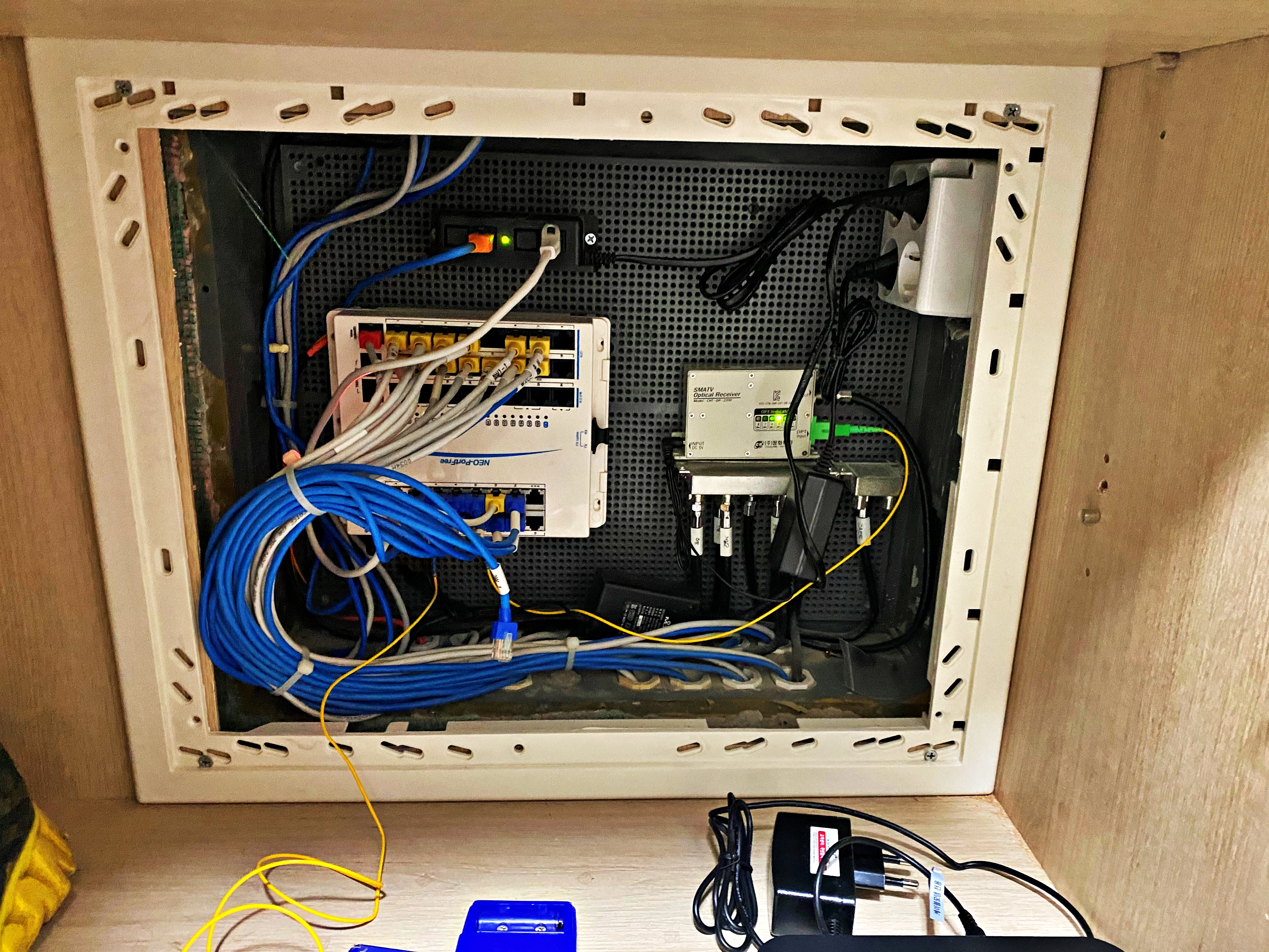 여튼 TV는 그냥 꼽고 인증만 받으면 나오니 따로 동축케이블에 손을 댈 이유는 없고, 인터넷만 만져주면 됩니다. 기존의 LG 공유기를 탈거한 뒤 스카이라이프 공유기를 설치해 줍니다. 이 과정에서 MDF실을 여러번 왔다갔다 하시고 애를 먹으셨습니다. 물어보니 KT에서 협조를 안해줘서 처음부터 끝까지 다 혼자 찾아야 한다고 하네요. 내내 같은 KT망을 사용하지만, KT에서도 경쟁자로 인식하는 모양입니다.
