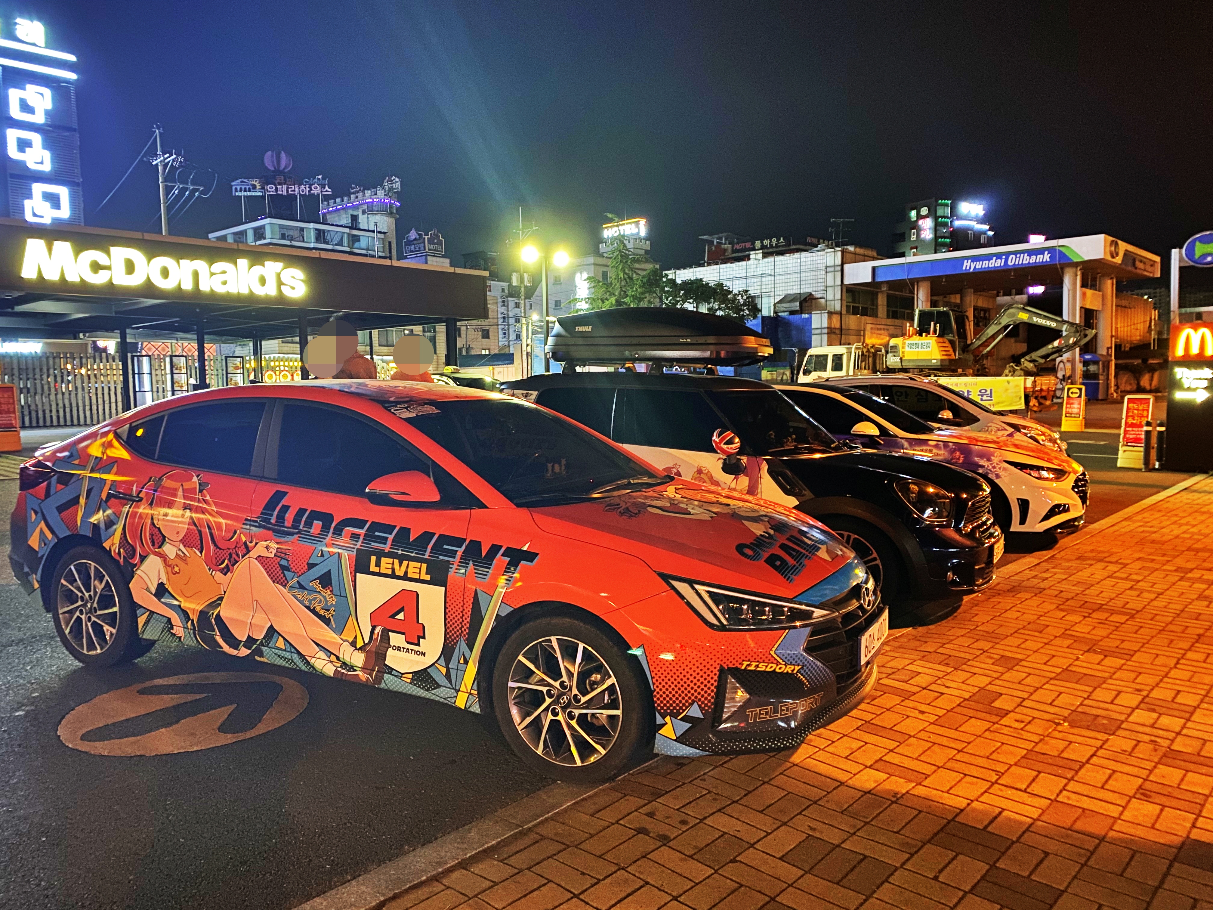 이전에는 말 그대로 데칼처럼 부분적으로 캐릭터만 잘라 붙이는 형태로 부착했다면, 최근 작업되는 차량들은 거의 풀랩핑에 가깝게 붙이는 방식이 대세처럼 자리 잡았습니다. 본넷과 측면을 사실상 다 덮어버리는 형태인데, 그런 경우 차체 색상과 이질감이 생겨버리곤 합니다. 그래도 보색을 잘 맞춰주면 그럭저럭 어울리지만, 그렇지 않은 경우 붕 뜬 느낌이 상당하지요.