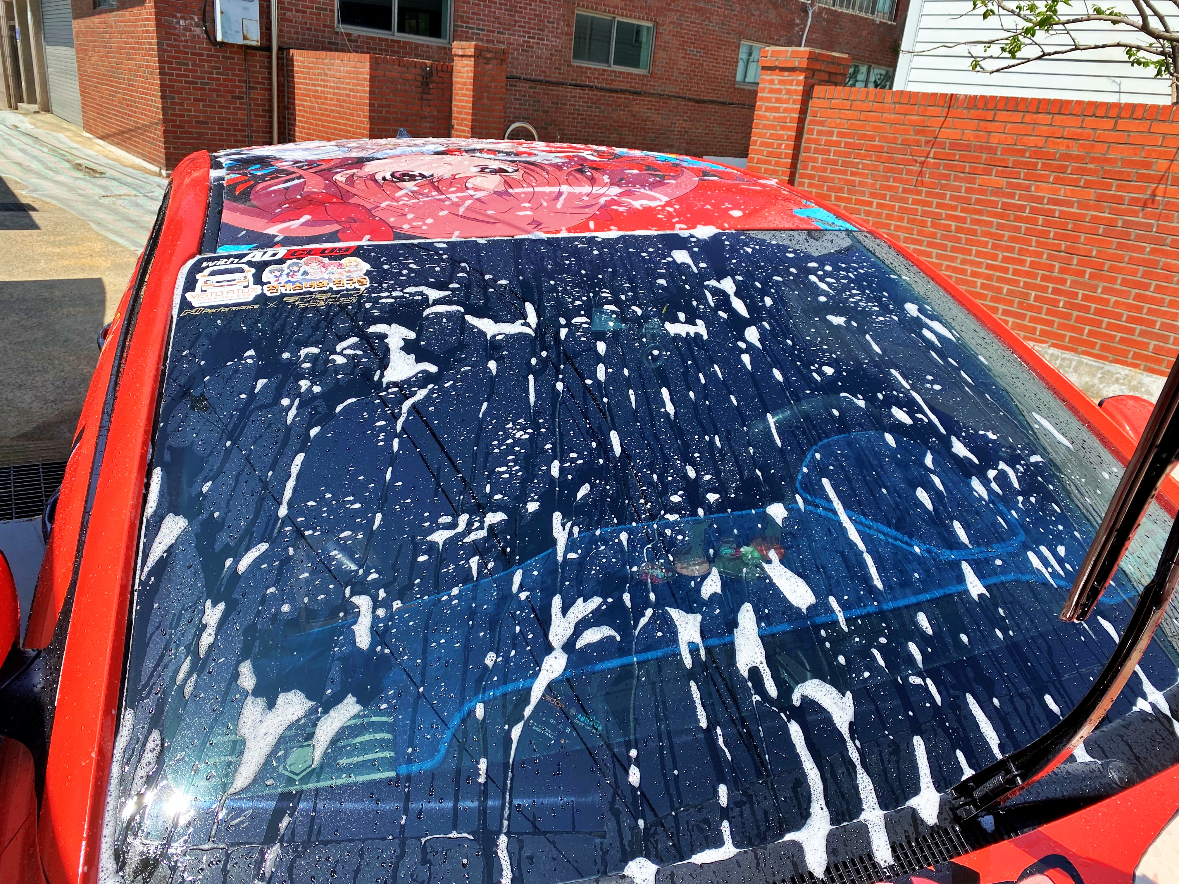 다만 항상 폼을 넉넉하게 뿌리고 미트질을 하는지라 혹시 거품이 부족해서 흠집이 생기지 않을까 하는 우려에서 뿌리는 카샴푸를 넉넉하게 뿌렸습니다. 물론 미트와 차체에 모래 알갱이 같은 이물질이 없다면 큰 우려는 하지 않아도 됩니다만, 아니 무엇보다도 제 차는 실사 풀랩핑차라 흠집 따위에 딱히 연연하지 않아도 됩니다만 그래도 항시 세차를 할 때마다 챙기고 있습니다.