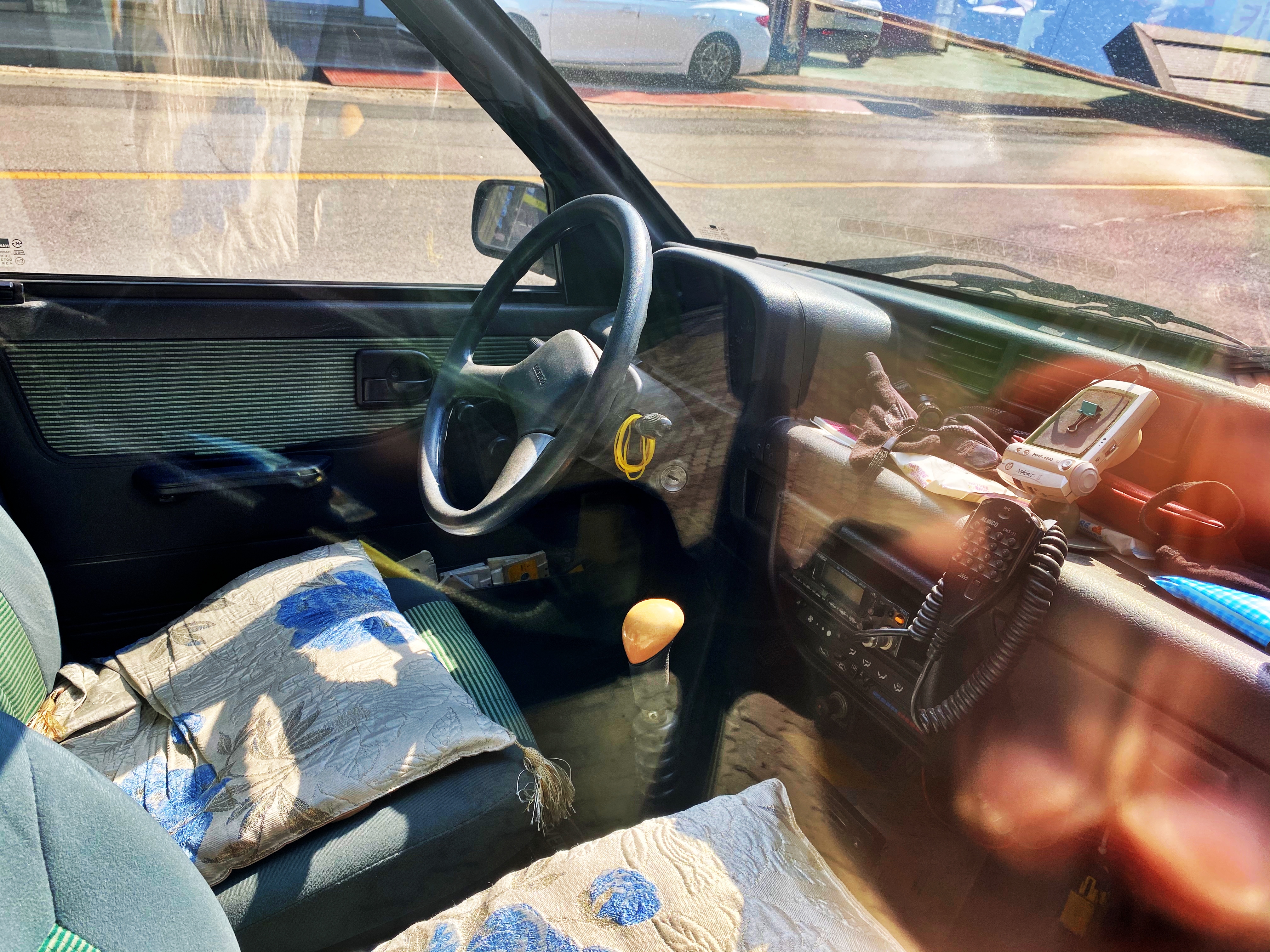 도어트림 포켓에는 테이프가 가득하고, 대시보드 위에는 추억의 핸즈프리의 모습도 보이네요.