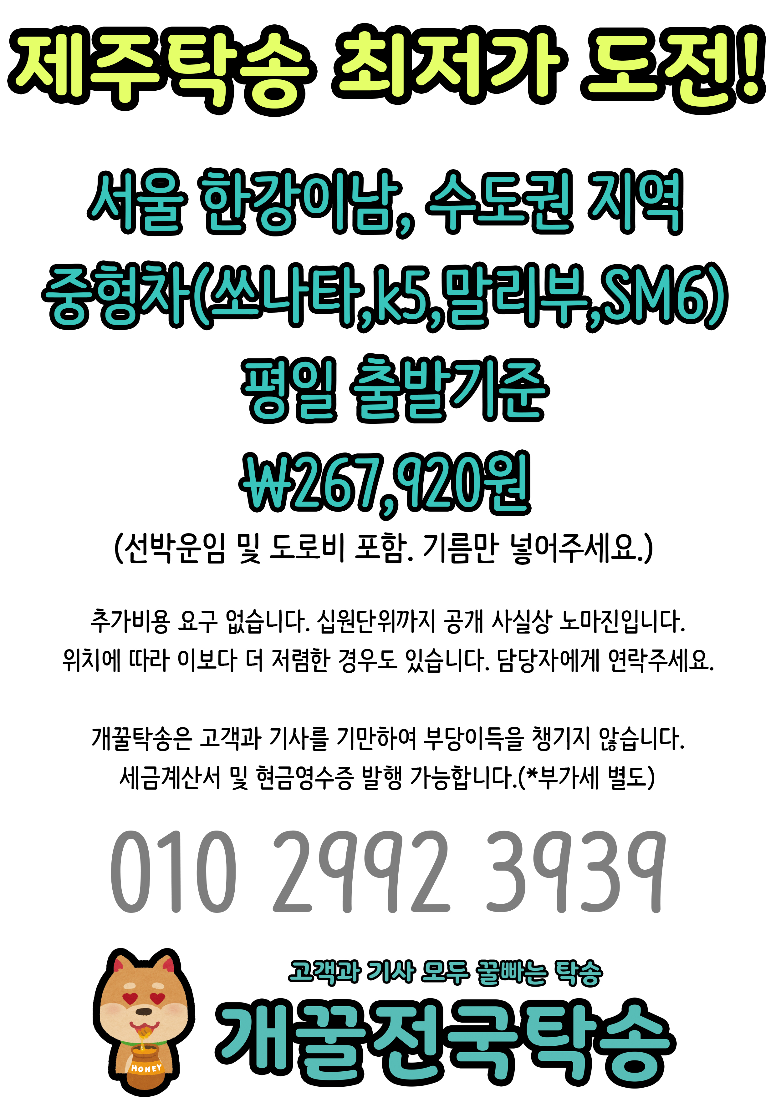 서울 한강이남, 수도권, 국산 중형차 평일 기준 267,920원에 제주항까지 차량을 보내드립니다.