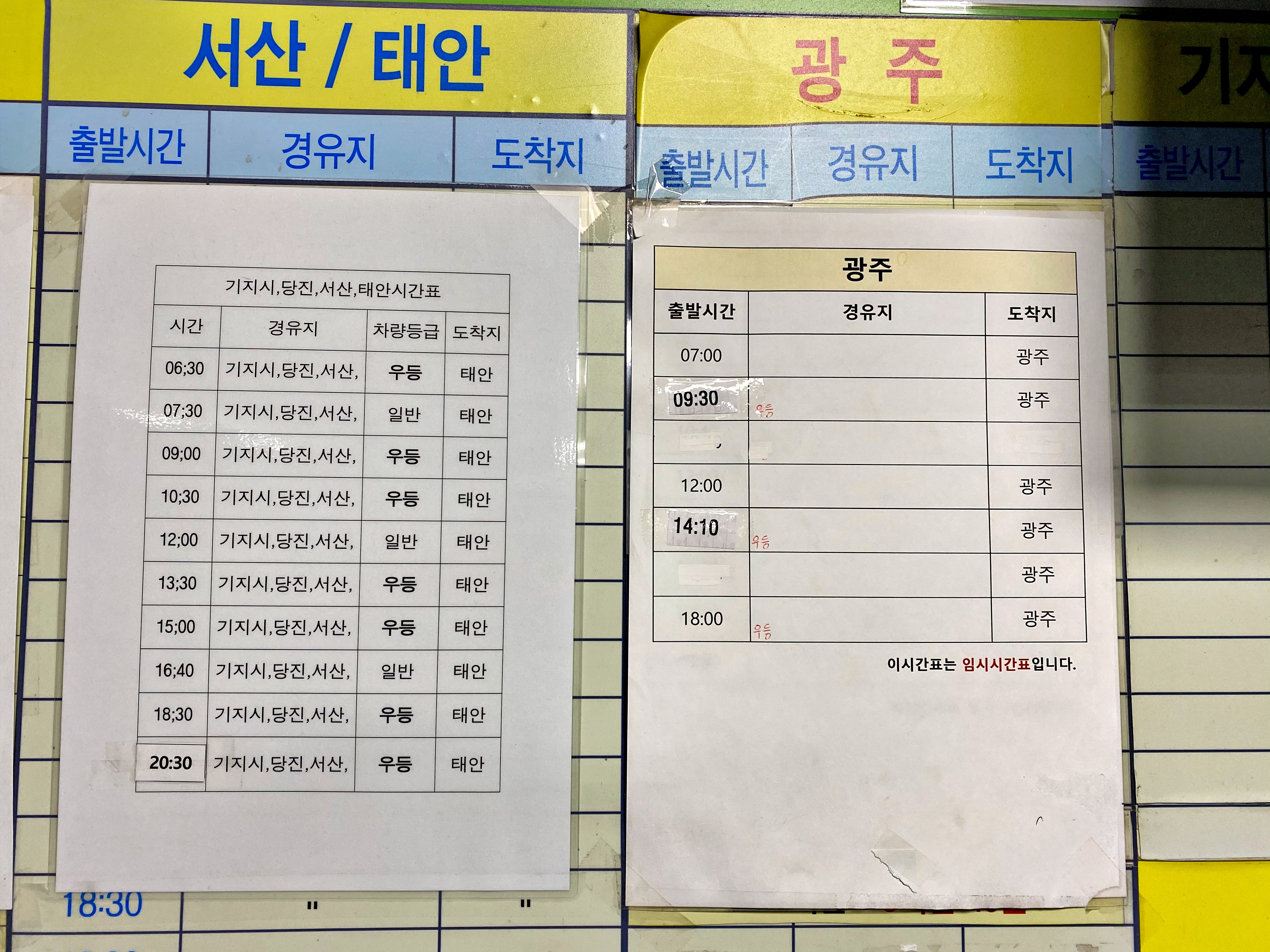당진-서산-태안행 시간표와 광주행 시간표입니다.