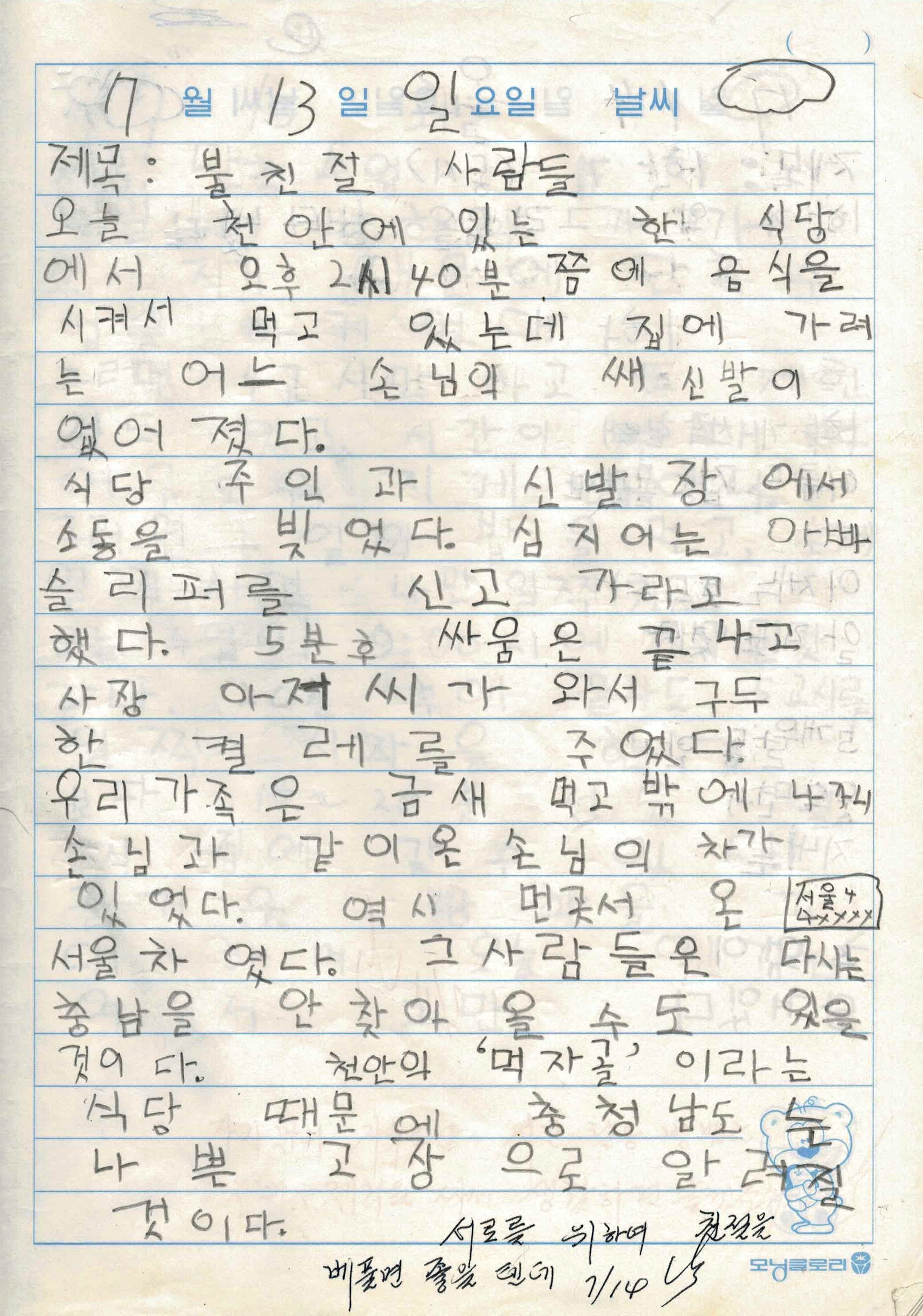 2021년 첫 초딩일기입니다. 2003년 7월 13일의 일기를 가지고 왔는데, 천안의 한 식당에서 있던 일입니다. 손님의 신발이 도둑맞았던 일인데, 신발 분실 시 책임지지 않는다는 문구도 없었고 오히려 다른 사람의 신발을 신고 가라는 식당 사장의 적반하장식 대응으로 우리 지역의 이미지 실추를 우려하는 내용입니다.