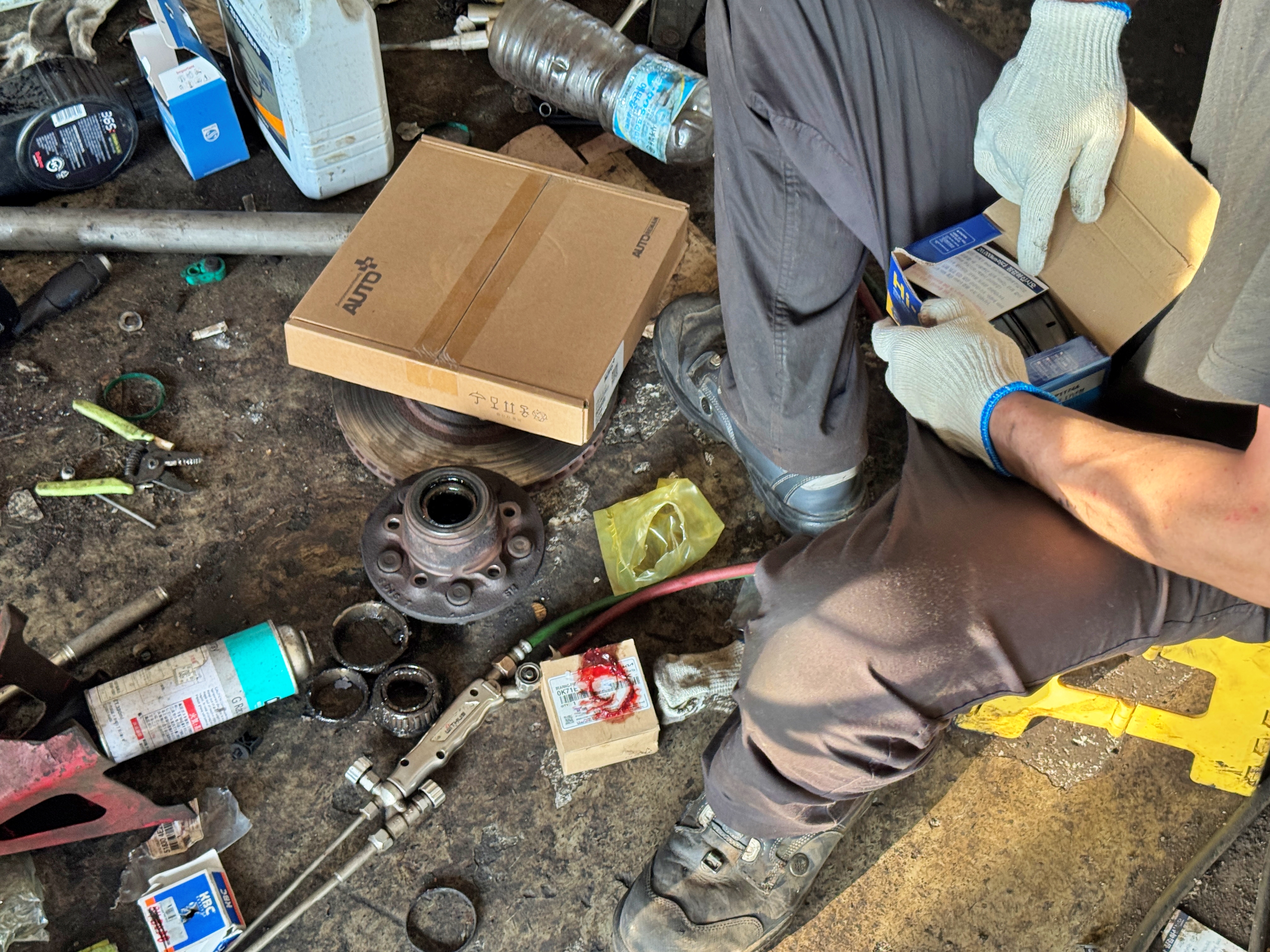 일단 전륜 패드와 디스크를 탈거합니다. 쩔어서 탈거에 힘든 볼트까지 다 풀고 허브까지 뜯어냈네요.