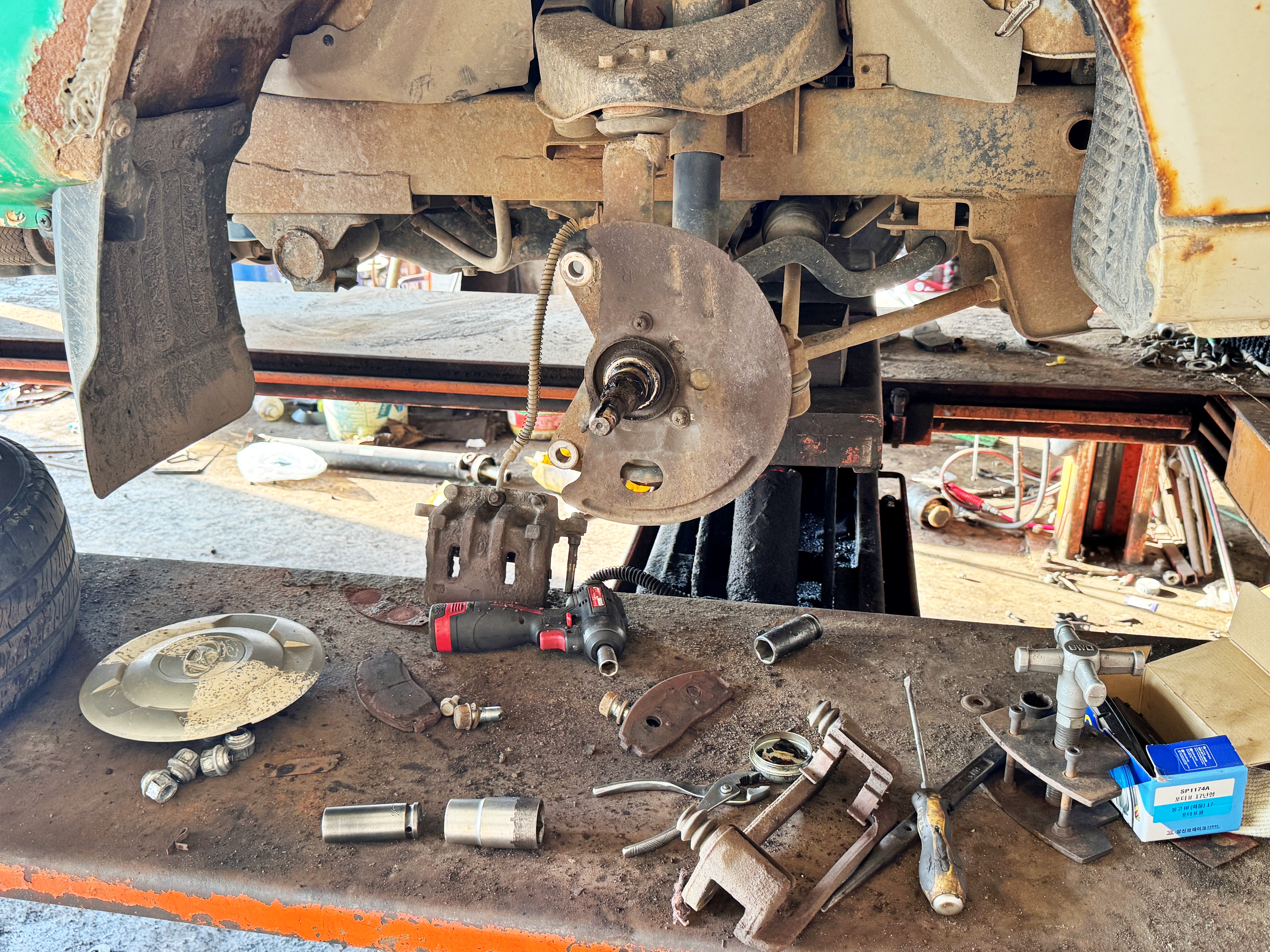 포터2 후륜 슈 라이닝 교체 및 허브베어링 구리스 작업