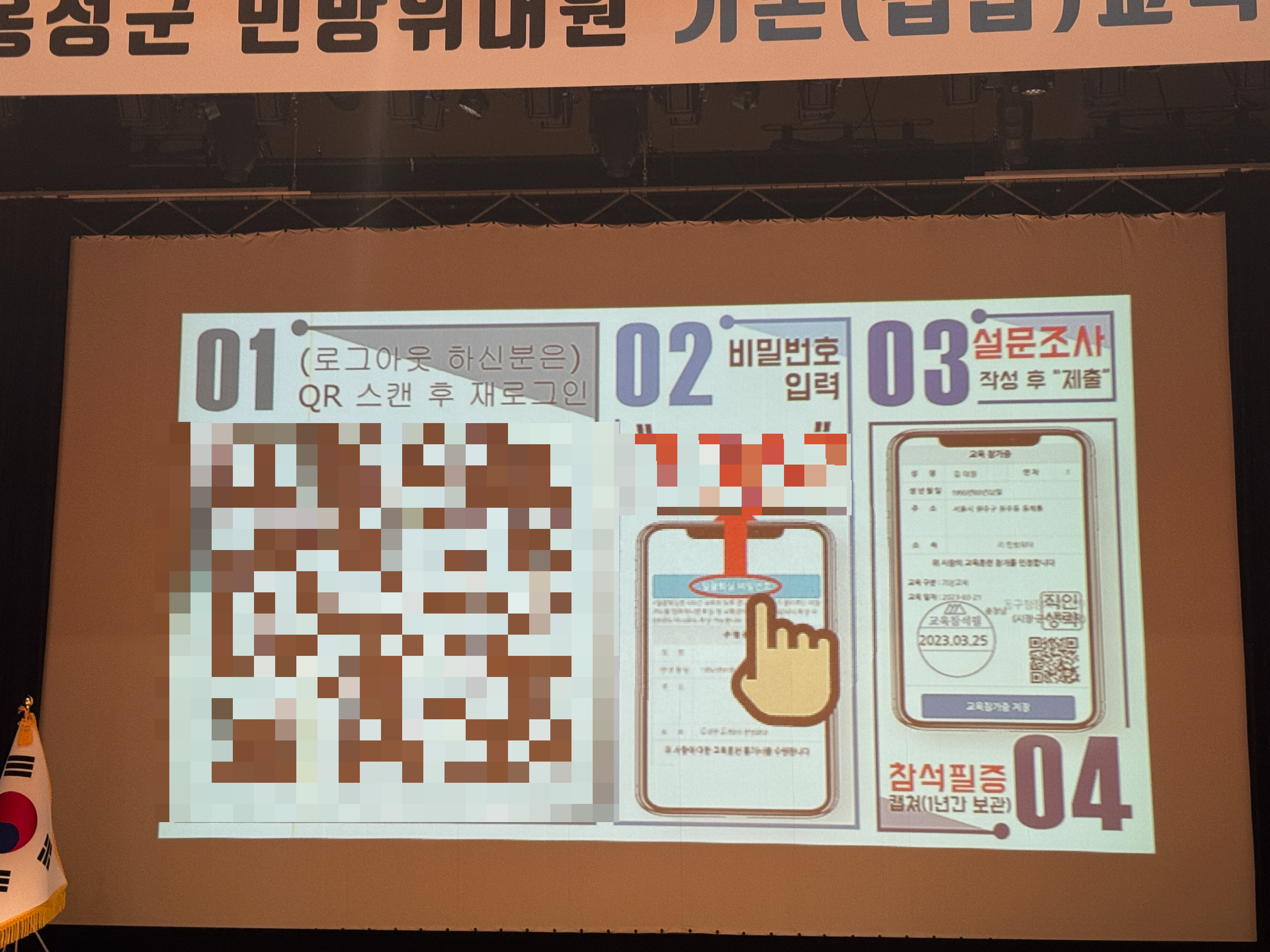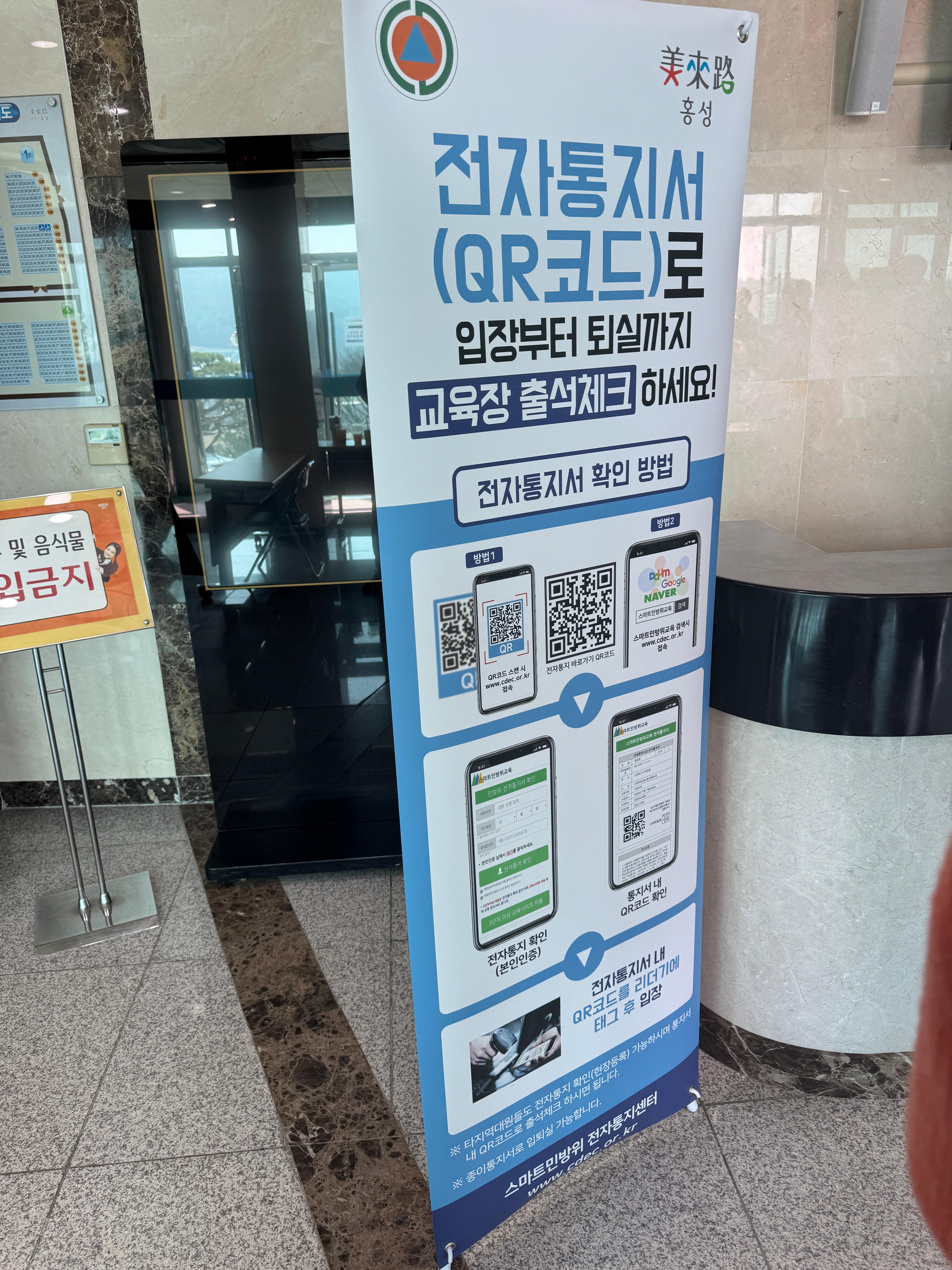 2년 차라 익숙하게 교육장 앞으로 올라오며 민방위 통지서를 켜놓은 뒤 QR코드를 인식시켰습니다.