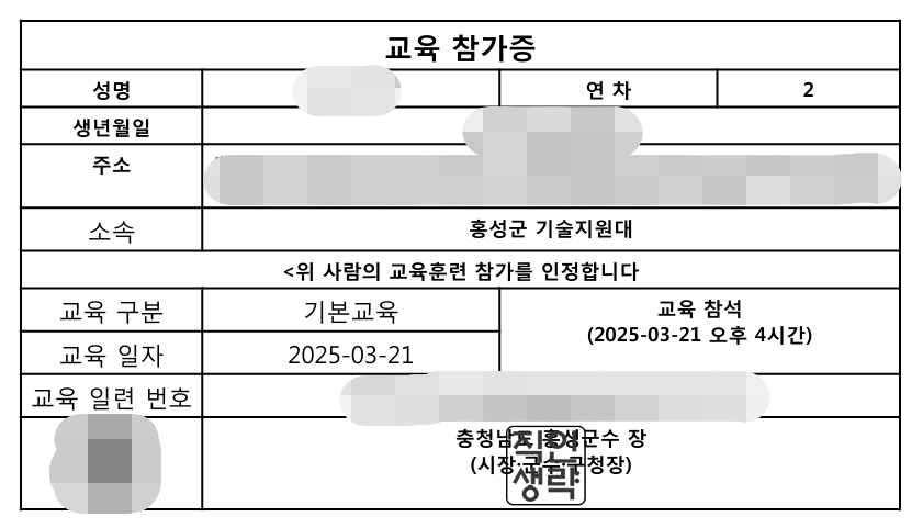 보충교육은 우편으로도 통지서가 왔었는데 정규 교육은 스마트 통지서만 오고 마는군요. 통지서 하단의 QR코드로 입실과 퇴실을 확인하고 체크합니다. 이 QR코드의 인식이 어려운 경우 수기로 체크를 하는데 다행히 1년 차 2년 차 모두 별문제 없이 QR코드를 찍고 들어갔다 나왔습니다.