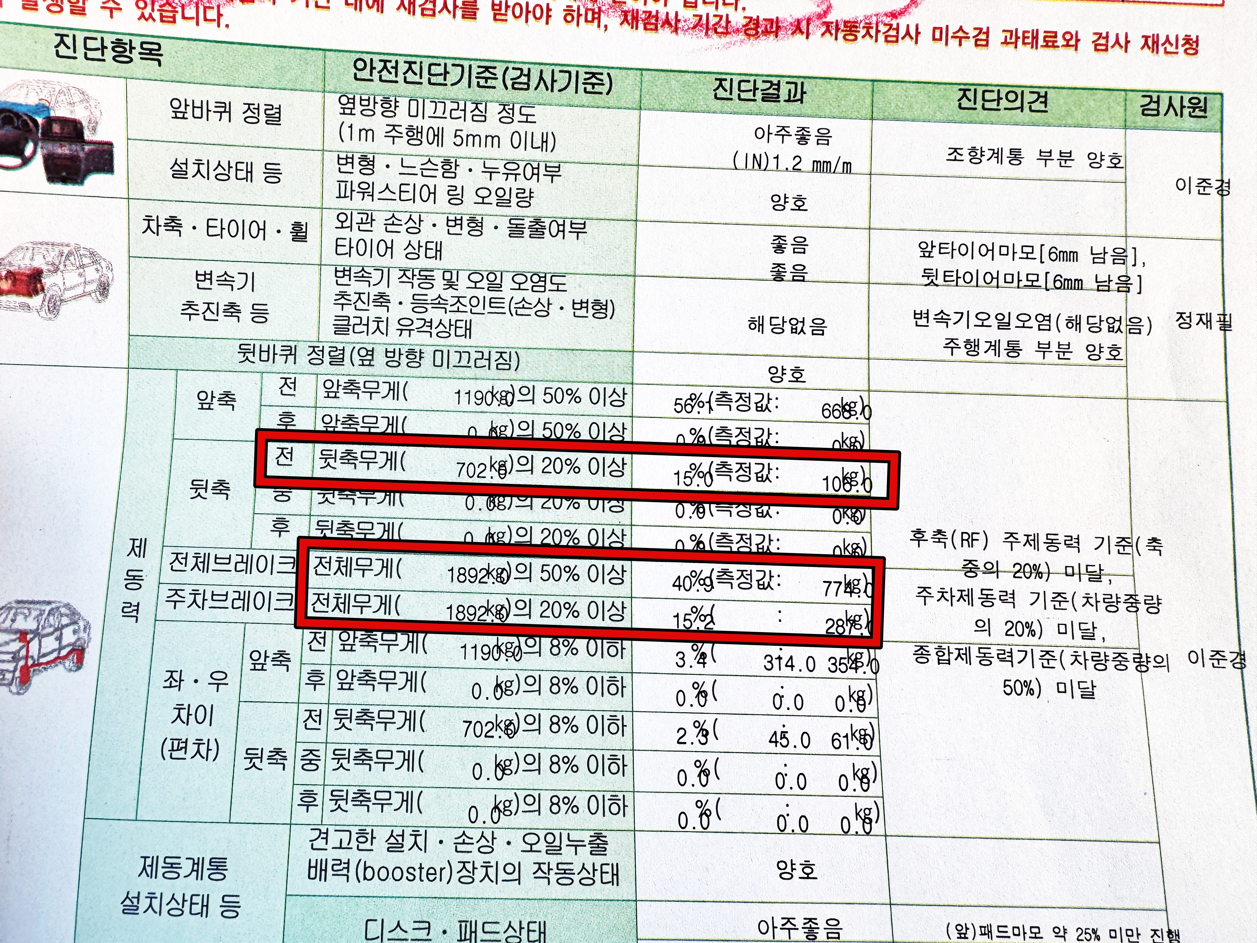 뒷축 제동력이 뒷축 무게의 20% 이상 나와야 하는데 15%만 나옵니다.