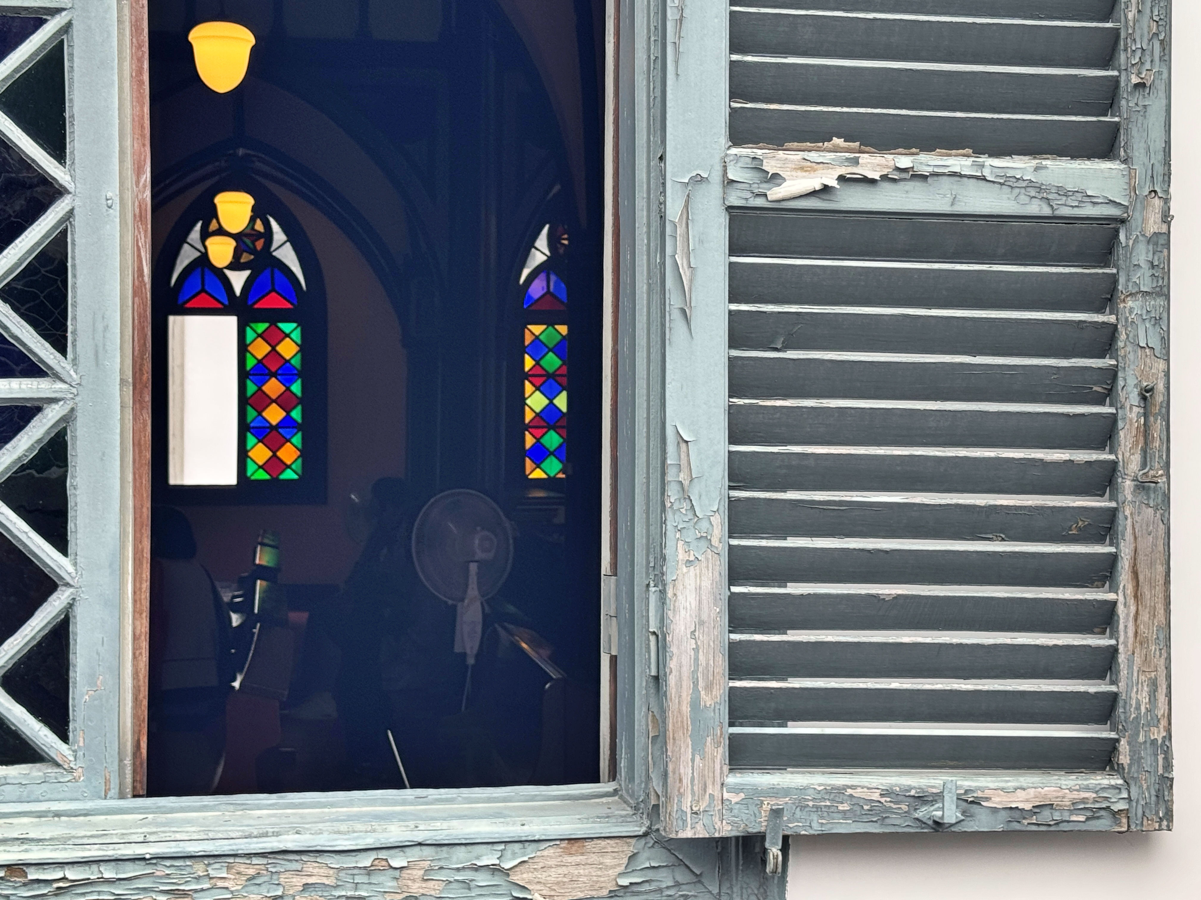 알록달록한 색유리도 그렇고 일반적으로 생각하는 성당의 모습과 비슷하리라 생각됩니다. 구글맵을 보니 좀만 더 올라갔으면 전망대가 있었는데 결국 사람도 없고 공동묘지만 있는 언덕길에서 창문 너머의 모습만 구경한 뒤 내려왔습니다.
