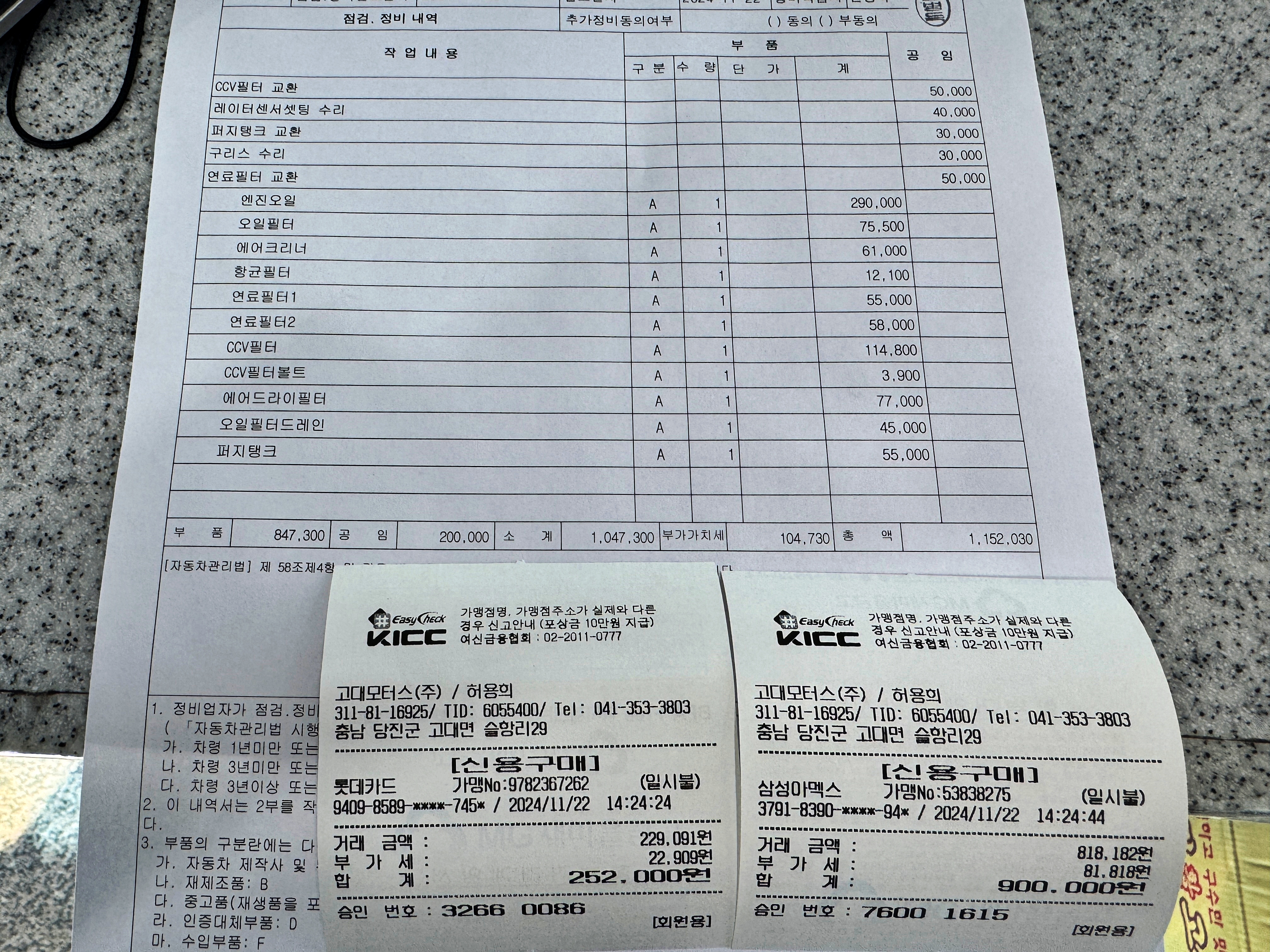 카드 실적을 채우기 위해 카드 두 개로 나눠 결제했습니다. 할부가 싫기에 모두 일시불로 끊었고요. 온갖 잡다한 필터들과 퍼지탱크 가격까지 부품대만 847,000원. 공임은 20만 원. 부가세가 포함되니 115만 원이라는 청구비용이 나타납니다. 1년에 한 번 교체하는 수준의 소모품들이 들어가서 이 비용이 발생하긴 했지만 겨우내 손가락 빨고 다녀야겠습니다.