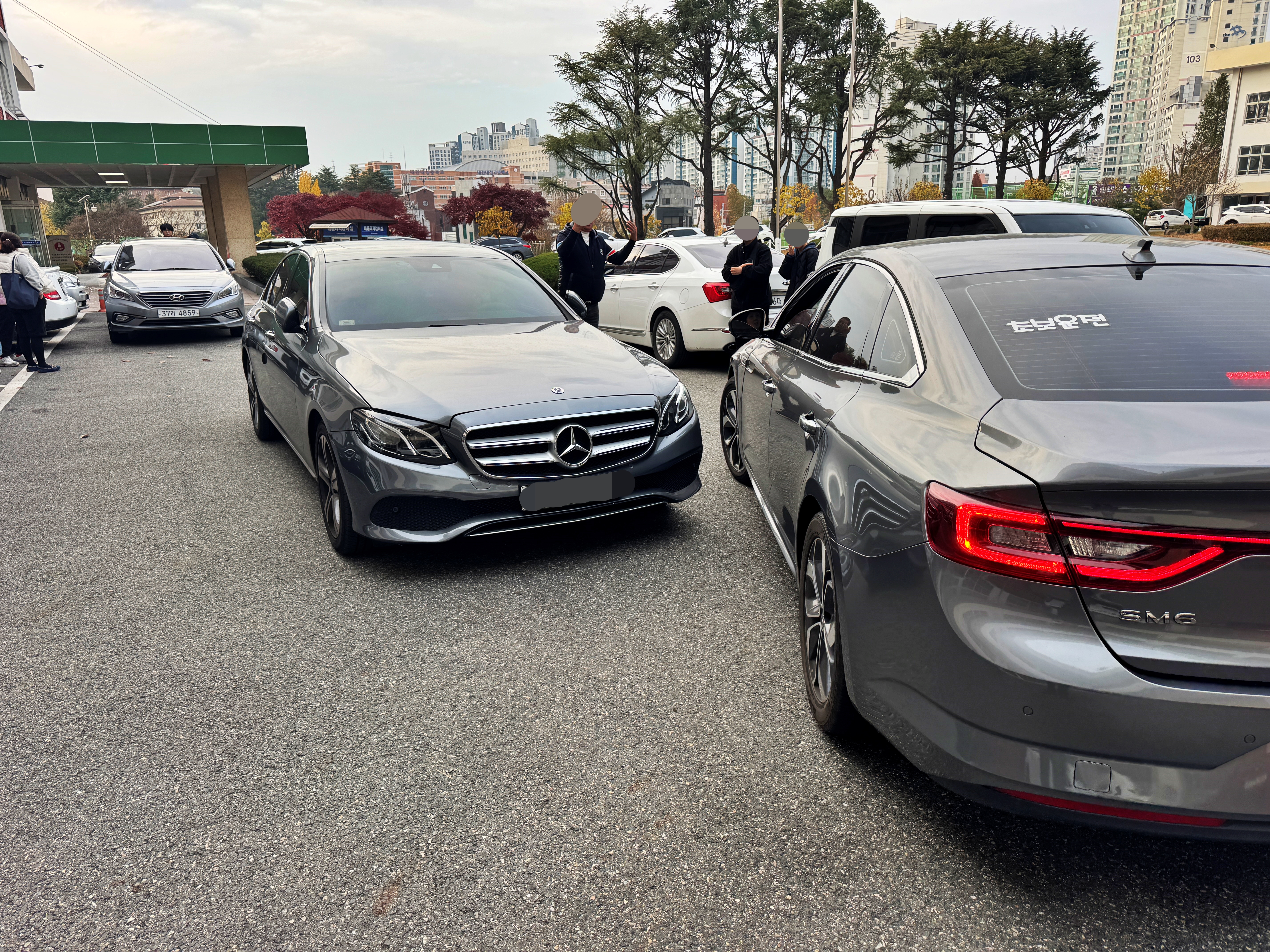 저기 그랜저도 사이에 있던 차량인데 겨우 후진으로 빼서 나갔고.. 저 벤츠 한 대 때문에 주차선에 세운 차들이 다 출차를 못 하고 있었습니다. 그나마 주변에 세운 차주들이 하나 둘 오며 빠지며 공간이 생기니 겨우 나가긴 하더군요.